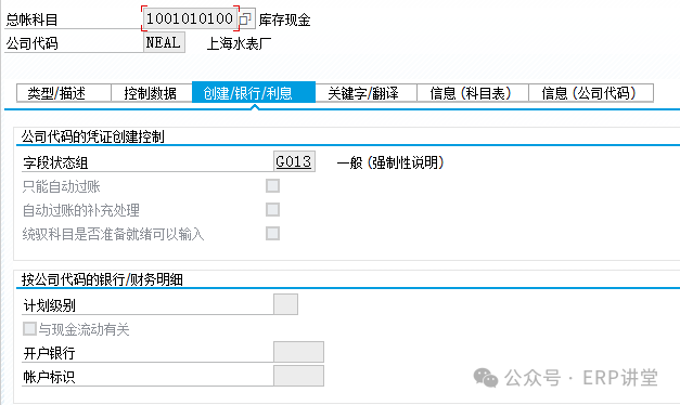 字段狀態(tài)組:控制會計憑證錄入時,行項目字段狀態(tài); 只能自動過賬:選中該標(biāo)識,無法手工做賬,只能通過系統(tǒng)集成過賬,材料類科目,GRIR,發(fā)出商品,主營業(yè)務(wù)收入與主營業(yè)務(wù)成本等; 統(tǒng)御科目是否準(zhǔn)備就緒可以輸入:對統(tǒng)馭科目記賬時是否可以更改,在過賬時可以手工更改需要統(tǒng)馭科目;(需要后臺配置對應(yīng)關(guān)系); 開戶行/賬戶標(biāo)識:如果該科目時銀行賬戶科目,可以設(shè)定關(guān)聯(lián)的開戶行和賬戶;