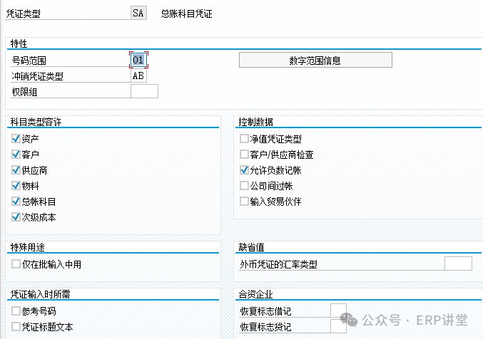 號碼范圍:財務(wù)憑證的編號范圍; 沖銷憑證類型:沖銷該憑證類型的憑證時,生成沖銷憑證的憑證類型; 權(quán)限組:與用戶主數(shù)據(jù)的權(quán)限設(shè)定相配合控制只有擁有特定權(quán)限的用用戶可以過賬該憑證類型。 科目類型容許:該類型的憑證中允許過賬哪些類型的科目。 凈值憑證類型:供應(yīng)商發(fā)票過賬時現(xiàn)金折扣是否從應(yīng)付賬款扣減或(現(xiàn)金折扣一般作為財務(wù)費用而不從應(yīng)付賬款中扣減)。 客戶/供應(yīng)商檢查:控制一個憑證中是否只能使用一個供應(yīng)商或客戶。 允許負(fù)數(shù)記賬:是否允許反記賬(必須選則) 公司間過賬:控制在會計憑證中是否允許輸入兩個或兩個以上貿(mào)易伙半(即使不勾選本標(biāo)記也可以跨公司代碼記賬) 貿(mào)易伙伴:控制是否可以手工輸入貿(mào)易伙伴; 憑證輸入時所需:控制這兩個字段是否必輸; 僅在批輸入中用:不用直接記賬,必須通過批處理程序記賬; 外幣憑證的匯率類型:如果設(shè)置,對應(yīng)的憑證優(yōu)先使用這里的匯率類型對應(yīng)的匯率記賬;