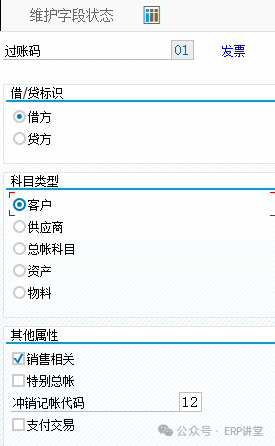 借方/貸方:控制憑證行項目的借貸方。 賬戶類型:控制可以過賬哪些科目。 銷售相關(guān):控制憑證行項目的金額是否計入事務(wù)碼FD10N/FK1ON的"購銷"項目。