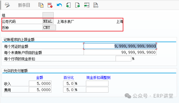 13.定義容差組 事務(wù)代碼:OBA4 系統(tǒng)路徑:IMG→財務(wù)會計->財務(wù)會計全局設(shè)置->憑證->容差組->定義雇員容差組 配置目的:設(shè)置憑證記賬的最大金額和允許的支付差額 配置屏幕: