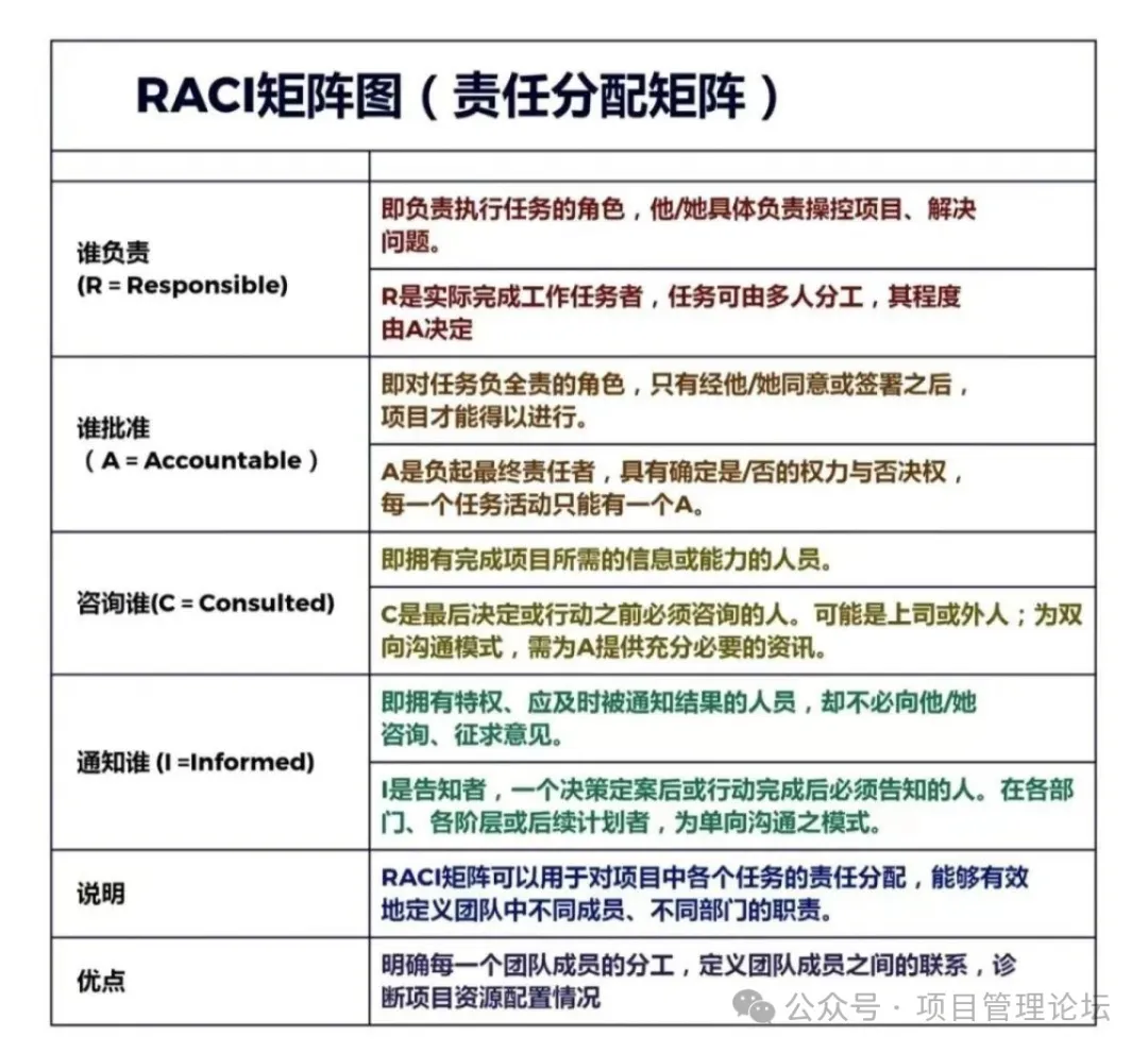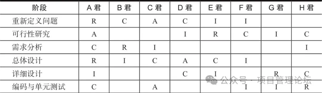 討論和確定好RACI后,必須將RACI傳達(dá)給項(xiàng)目中(至少是組織內(nèi)部)的相關(guān)人員。需要注意的是,每項(xiàng)活動(dòng)有且只能有一個(gè)R。如果不能對某項(xiàng)職務(wù)劃分責(zé)任,則該活動(dòng)需要進(jìn)一步細(xì)分。如果項(xiàng)目管理團(tuán)隊(duì)成員在其欄內(nèi)沒有R,那么他不是項(xiàng)目管理團(tuán)隊(duì)的真正成員,可能是擴(kuò)大范圍的團(tuán)隊(duì)成員(他不具有任何責(zé)任,因此他不實(shí)施管理,而是執(zhí)行)。