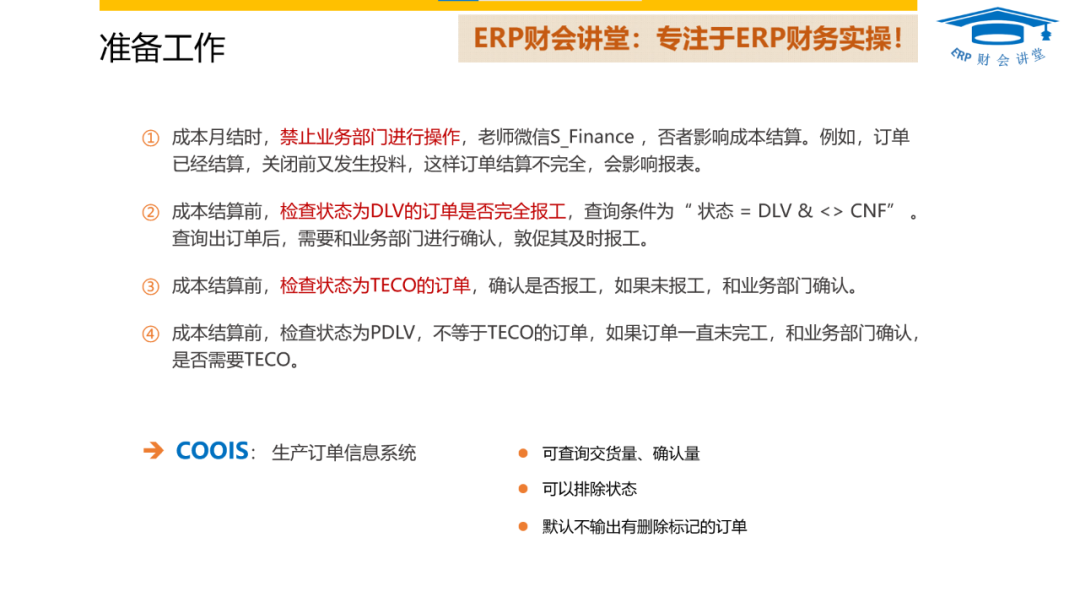 關(guān)于工單狀態(tài),我們?cè)凇?/span>SAP軟件 生產(chǎn)工單狀態(tài)》一文中有詳細(xì)的介紹,每個(gè)狀態(tài)代表什么含義,以及哪些狀態(tài)和財(cái)務(wù)相關(guān)。在《CO成本管理》課程中,也強(qiáng)調(diào)過(guò),成本月結(jié)之前需要檢查工單狀態(tài),并且也介紹了工單狀態(tài)對(duì)財(cái)務(wù)結(jié)算的影響。