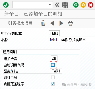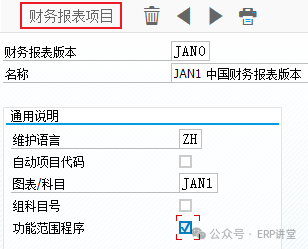 自動(dòng)項(xiàng)目代碼:在編輯報(bào)表版本的時(shí)候,每一行的行項(xiàng)目號(hào)是否可以手工輸入,如果選擇該項(xiàng),則不能手工輸入; 圖表/科目:每一個(gè)財(cái)務(wù)報(bào)表版本必須指定對(duì)應(yīng)的會(huì)計(jì)科目表; 功能范圍程序:如果啟用功能范圍,就必須選擇該功能,表示在編輯報(bào)表版本的時(shí)候,可以根據(jù)功能范圍取得數(shù)據(jù); 1.2維護(hù)報(bào)表版本的表項(xiàng): 點(diǎn)擊“財(cái)務(wù)報(bào)表項(xiàng)目”維護(hù)對(duì)應(yīng)的表項(xiàng);