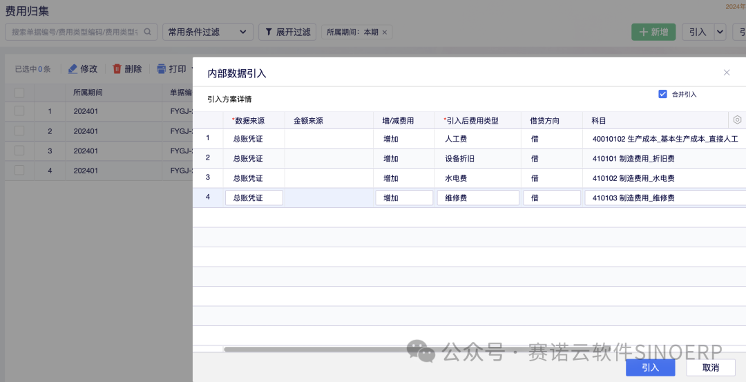 費(fèi)用類型名稱可以根據(jù)實(shí)際進(jìn)行修改,費(fèi)用分配標(biāo)準(zhǔn)支持三種類型,如下: 為方便起見,一般建議將費(fèi)用類型與生產(chǎn)費(fèi)用科目一一對應(yīng),比如: 人工費(fèi)——對應(yīng)“基本生產(chǎn)成本—直接人工,40010102(科目編碼)” 設(shè)備折舊——對應(yīng)“制造費(fèi)用—折舊費(fèi),410101(科目編碼)” 水電費(fèi)——對應(yīng)“制造費(fèi)用—水電費(fèi),410102(科目編碼)” ...... 當(dāng)然,此處只是為了方便而建議,并非說費(fèi)用類型一定要與總賬生產(chǎn)費(fèi)用科目一一對應(yīng),費(fèi)用類型與生產(chǎn)費(fèi)用科目的關(guān)系也可以是一對多、多對一 2:費(fèi)用歸集(生產(chǎn)費(fèi)用的來源) (1):直接材料,材料費(fèi)用取自生產(chǎn)任務(wù)單所對應(yīng)的生產(chǎn)領(lǐng)料單,更正確的說是生產(chǎn)任務(wù)單號+行號所對應(yīng)的生產(chǎn)領(lǐng)料單成本,所以需要注意的,如果是直接新增的生產(chǎn)領(lǐng)料單,并不會(huì)作為直接材料(材料費(fèi)用)或者更正確的說如果生產(chǎn)領(lǐng)料上沒有對應(yīng)的源單單號(生產(chǎn)任務(wù)單號)+源行號,此生產(chǎn)領(lǐng)料成本并不會(huì)進(jìn)入直接材料。由此也可以得出,直接材料(材料費(fèi)用)即是取自有源單單號(生產(chǎn)任務(wù)單號)+源行號的生產(chǎn)領(lǐng)料成本 如果是直接新增的生產(chǎn)領(lǐng)料單或者是沒有源單單號(生產(chǎn)任務(wù)單號)+源行號的生產(chǎn)領(lǐng)料成本,一般建議科目中設(shè)置“制造費(fèi)用—共耗材料”,將此類生產(chǎn)領(lǐng)料成本生成在此科目中,同時(shí)在費(fèi)用類型也設(shè)置此對應(yīng)的費(fèi)用類型(比如):共耗材料 (2):直接人工和制造費(fèi)用 以上提到,一般建議將費(fèi)用類型與生產(chǎn)費(fèi)用科目一一對應(yīng),一方面是方便將這些費(fèi)用類型從總賬科目取數(shù),引入時(shí),選擇從“內(nèi)部數(shù)據(jù)引入”,同時(shí)選擇對應(yīng)的總賬科目,如下: