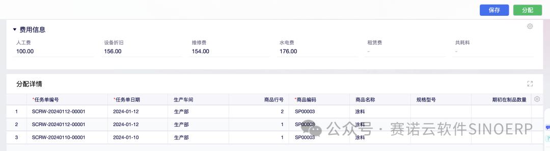 4)成本計(jì)算 在歸集完費(fèi)用和產(chǎn)量后,就可以進(jìn)行費(fèi)用分配和生產(chǎn)成本核算了 費(fèi)用分配,即將引入的費(fèi)用按照分配標(biāo)準(zhǔn)分配到相應(yīng)的(生產(chǎn)任務(wù)單號+行號)的產(chǎn)品上