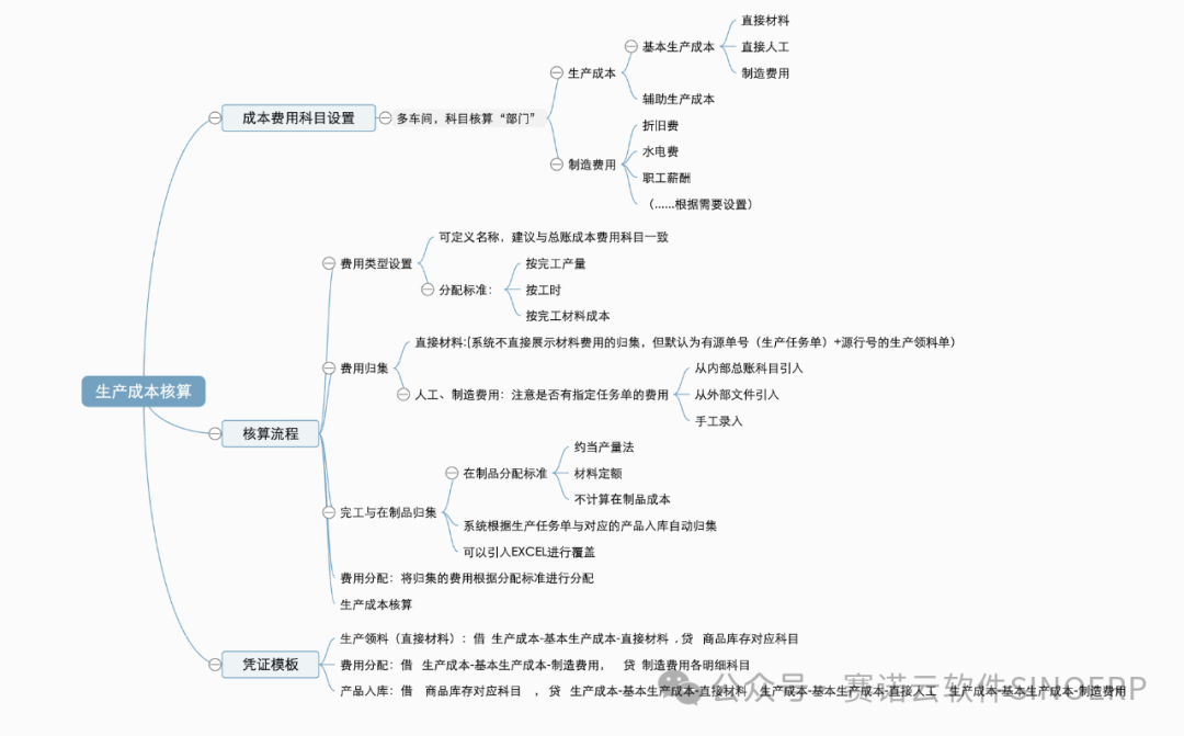 四:生產(chǎn)成本核算注意點(diǎn) 生產(chǎn)成本核算在于首先理解核算原理 注意投入產(chǎn)量、完工產(chǎn)量和在制品產(chǎn)量的準(zhǔn)確性。比如在某行業(yè)中,期末并不會(huì)有在制品,但由于系統(tǒng)投入產(chǎn)量默認(rèn)取自生產(chǎn)任務(wù)單的生產(chǎn)數(shù)量,實(shí)際的完工產(chǎn)量并不一定完全與投入產(chǎn)量一致,如果完全按照系統(tǒng)的取數(shù)就可能導(dǎo)致產(chǎn)生在制品數(shù)量,此時(shí)就需要人為干預(yù)投入產(chǎn)量,將投入產(chǎn)量修改為與完工產(chǎn)量一致 確認(rèn)哪些費(fèi)用需要參與歸集與分配,檢查歸集的費(fèi)用是否與實(shí)際發(fā)生的費(fèi)用是否一致,,直接材料是否與生產(chǎn)領(lǐng)料是否一致,是否有共耗材料發(fā)生的問題等,包括分配標(biāo)準(zhǔn)設(shè)置是否合理,分配標(biāo)準(zhǔn)值是否存在,都是需要注意之處。 附上整體的腦圖以供參考: