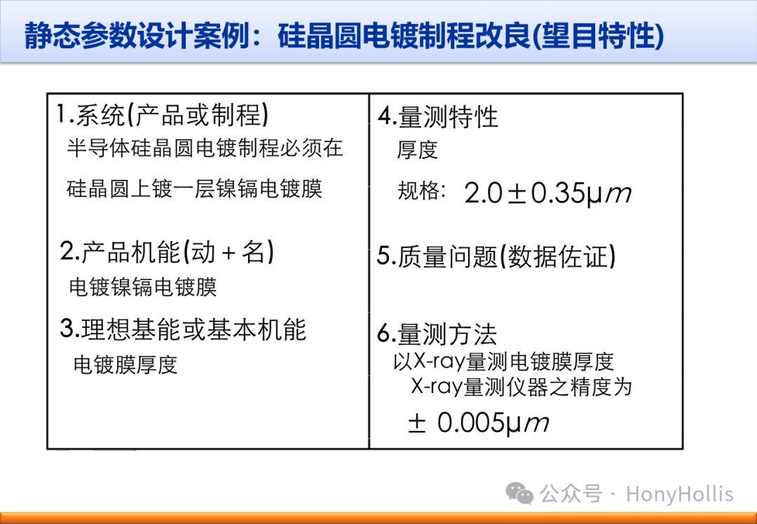 在當(dāng)今競爭激烈的市場環(huán)境中,企業(yè)不斷追求卓越的質(zhì)量和高效的生產(chǎn)。田口 DOE 法(靜態(tài)參數(shù))作為一種強(qiáng)大的質(zhì)量管理工具,為企業(yè)提供了實(shí)現(xiàn)這一目標(biāo)的有效途徑。 一、田口 DOE 法是由質(zhì)量管理大師田口博士創(chuàng)立,其在國際上久負(fù)盛名,曾在日本質(zhì)量管理學(xué)院任職,為眾多知名企業(yè)提供咨詢顧問服務(wù)。他開發(fā)的田口方法,是一套源于全面質(zhì)量管制與保證觀點(diǎn)的方法,用于縮短制程改善與產(chǎn)品開發(fā)周期。 二、田口 DOE 法通過對系統(tǒng)理想機(jī)能的思考、誤差因素的應(yīng)用以及 SN 比的衡量,能夠在產(chǎn)品研發(fā)設(shè)計和制程改善中發(fā)揮重要作用。它能幫助企業(yè)找出設(shè)計或制程的最佳條件組合,使變異最小化,從而提升產(chǎn)品質(zhì)量。 三、該方法的核心特色包括:一是著重 “系統(tǒng)理想機(jī)能” 思考,明確系統(tǒng)應(yīng)達(dá)到的最佳表現(xiàn);二是充分考慮 “誤差因素”,如外部雜音、內(nèi)部雜音和產(chǎn)品間的變異,通過控制、補(bǔ)償或減小雜音沖擊來應(yīng)對;三是以 SN 比衡量質(zhì)量,追求信號與噪聲比的最大化,確保系統(tǒng)輸出的穩(wěn)定性和可靠性。 四、田口 DOE 法還涉及一系列關(guān)鍵要素,如控制因素、信號因素、誤差因素等,以及多種質(zhì)量類型和系統(tǒng)輸出種類。通過合理選擇因素和配置實(shí)驗(yàn),如運(yùn)用直交表設(shè)計,能夠高效地獲取數(shù)據(jù)并進(jìn)行分析。 五、在實(shí)際應(yīng)用中,以硅晶圓電鍍制程改良為例,田口 DOE 法能夠顯著提升產(chǎn)品質(zhì)量。通過明確系統(tǒng)、選取因素、配置實(shí)驗(yàn)、收集分析數(shù)據(jù)等步驟,確定最適條件,從而大幅降低變異,提高生產(chǎn)效率和產(chǎn)品質(zhì)量。這一方法為企業(yè)在質(zhì)量管理和優(yōu)化方面提供了寶貴的思路和方法,助力企業(yè)在市場競爭中脫穎而出。 以下便是關(guān)于田口DOE法的相關(guān)資料: