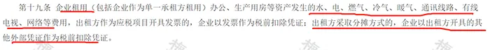 違法事實: 2022年,合同年租金7833284.8元,成本費用實際列支租金7239118.13元,收到發(fā)票金額3621284.8元,未收到發(fā)票金額3617833.33元,造成他人少繳房產(chǎn)稅217070.00元,印花稅1808.92元,個人所得稅275644.44元,合計造成他人少繳稅款494523.36元。 2023年,合同年租金6935878.20元,成本費用實際列支租金6935878.20元,收到發(fā)票金額3630116.80元,未收到發(fā)票金額3305761.40元,造成他人少繳房產(chǎn)稅198345.68元,印花稅1652.88元,個人所得稅251867.54元,合計造成他人少繳稅款451866.10元。 該公司未按規(guī)定取得發(fā)票,造成他人少繳稅款1640810.11元,最終被處以罰款82.33萬元。 租房的水電費都是房東個人 水電費的戶名都是房東,也不能直接開給公司。因為發(fā)票抬頭是房東的,不符合增值稅進項稅額的抵扣規(guī)定,存在不能抵扣進項稅額的問題。 但是,公司租房子支付的水電費發(fā)票抬頭是房東的,卻可以作為企業(yè)所得稅的稅前扣除憑證。 根據(jù)《企業(yè)所得稅稅前扣除憑證管理辦法》第十九條規(guī)定:租房產(chǎn)生的水電等費用,出租方可以和承租方采取分攤的方式處理! 水電費發(fā)票抬頭是房東個人的稅前扣除資料:發(fā)票、發(fā)票分割單。 除了上述資料,在租賃合同條款中亦需要約定分攤,使得相關(guān)憑證更加合理合規(guī)。 (分割單樣式) 注意:分割單不可以作為增值稅的抵扣憑證來抵扣增值稅。 一、增值稅 二、個人所得稅 個人將承租房屋轉(zhuǎn)租取得的租金收入,屬于個人所得稅應(yīng)稅所得,應(yīng)按“財產(chǎn)租賃所得”項目計算繳納個人所得稅。對個人出租住房取得的所得減按10%的稅率征收個人所得稅。 在計算財產(chǎn)租賃所得時,納稅人可依次扣減財產(chǎn)租賃過程中繳納的稅費、向出租方支付的租金、由納稅人負擔的租賃財產(chǎn)實際開支的修繕費用以及稅法規(guī)定的費用扣除標準。根據(jù)個人所得稅法規(guī)定,財產(chǎn)租賃所得費用扣除標準為,每次收入不超過4000元的,減除費用800元;4000元以上的,減除20%的費用。 三、房產(chǎn)稅 此外,教育費附加、地方教育附加方面,根據(jù)《財政部 國家稅務(wù)總局關(guān)于擴大有關(guān)政府性基金免征范圍的通知》(財稅〔2016〕12號)規(guī)定,如果月租金不超過10萬元,予以免征。 一、增值稅 1.一般規(guī)定 2.減免規(guī)定 (1)對經(jīng)營公租房所取得的租金收入,免征增值稅。公租房經(jīng)營管理單位應(yīng)單獨核算公租房租金收入,未單獨核算的,不得享受免征增值稅優(yōu)惠政策。 (2)軍隊空余房產(chǎn)租賃收入,免征增值稅。 二、城建稅及附加稅 三、房產(chǎn)稅 1.一般規(guī)定 企業(yè)出租房屋,以房產(chǎn)租金收入為房產(chǎn)稅的計稅依據(jù),稅率為12%。 無租使用其他單位房產(chǎn)的應(yīng)稅單位和個人,依照房產(chǎn)余值代繳納房產(chǎn)稅。 對出租房產(chǎn),租賃雙方簽訂的租賃合同約定有免收租金期限的,免收租金期間由產(chǎn)權(quán)所有人按照房產(chǎn)原值繳納房產(chǎn)稅。 2.減免規(guī)定 (1)對企事業(yè)單位、社會團體以及其他組織按市場價格向個人出租用于居住的住房,減按4%的稅率征收房產(chǎn)稅。 (2)對按政府規(guī)定價格出租的公有住房和廉租住房,包括企業(yè)和自收自支事業(yè)單位向職工出租的單位自有住房;房管部門向居民出租的公有住房;落實私房政策中帶戶發(fā)還產(chǎn)權(quán)并以政府規(guī)定租金標準向居民出租的私有住房等,暫免征收房產(chǎn)稅。 (3)對公租房免征房產(chǎn)稅優(yōu)惠期限延長至2027年12月31日。 (4)2021年1月1日至2027年12月31日,增值稅小規(guī)模納稅人可以在50%的稅額幅度內(nèi)減征房產(chǎn)稅。 四、城鎮(zhèn)土地使用稅 五、印花稅