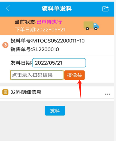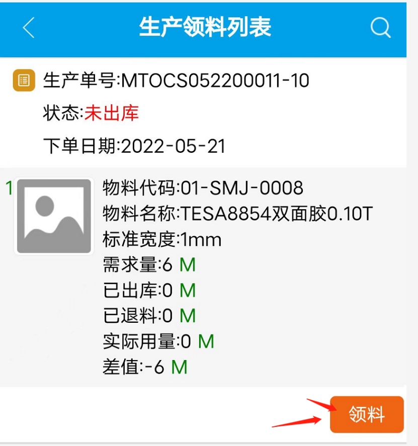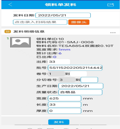 ![]() ![]() 生產(chǎn)領(lǐng)料掃碼出庫 1. 對分切好的物料進(jìn)行掃碼出庫,點(diǎn)擊app的選擇單一工單號掃碼發(fā)料 ![]() 2. 在本界面找剛剛新增的生產(chǎn)工單,然后點(diǎn)擊”領(lǐng)料” ![]() 3. 在本界面點(diǎn)擊攝像頭,掃描生產(chǎn)工單所需要的物料.然后點(diǎn)擊發(fā)料 ![]() ![]() ?4.然后會彈出 出庫成功的信息