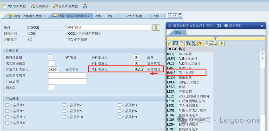 在物料主數(shù)據(jù)的銷售組織2視圖中,在特定的組織機構(gòu)下,項目類別組的維護值是“BANS”,也就是上面定義的值(在庫發(fā)銷售的案例中,項目類別組我們選擇的是“NORM標(biāo)準(zhǔn)項目”,大家可以做個對照)。如下圖: