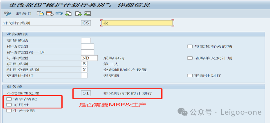 在SAP第三方銷售中,做入庫管理的計劃行類別既可能是CS,也可能是CB,具體取決于業(yè)務(wù)場景和配置: 計劃行類別為CS的情況:當(dāng)供應(yīng)商直接向客戶發(fā)貨,不涉及公司自身的入庫和出庫操作時,通常使用計劃行類別CS。在這種情況下,銷售訂單創(chuàng)建時,系統(tǒng)通過銷售訂單行項目類別TAS帶出計劃行類別CS,其配置決定了保存第三方銷售訂單時會自動產(chǎn)生采購申請,觸發(fā)向供應(yīng)商的采購流程,而無需公司進行收貨等入庫操作。 計劃行類別為CB的情況:當(dāng)供應(yīng)商發(fā)貨后,公司需要做入庫操作,再發(fā)送給客戶時,計劃行類別則為CB。此時,物料主數(shù)據(jù)的項目類別組取值 “BANC”,訂單的項目類別是 “TAB”,通過配置可得到計劃行類別CB。這種配置下,銷售訂單創(chuàng)建時同樣會生成采購申請,后續(xù)公司會進行收貨入庫等操作。 上面的計劃行類別是通過VOV6來定義的,如下: 5、定義計劃行類別VOV6 路徑:SPRO-銷售與分銷-銷售-銷售憑證-計劃行-定義計劃行類別