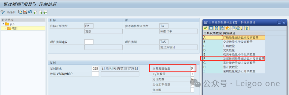 6、維護開票憑證的復(fù)制控制 路徑:SPRO-銷售與分銷-出具發(fā)票-開票憑證-維護開票憑證的復(fù)制控制 銷售開票數(shù)量,它是如何帶到發(fā)票憑證的呢?通過配置,決定發(fā)票數(shù)量來自于采購訂單的收貨數(shù)量,還是來自采購訂單的發(fā)票校驗數(shù)量(這兩個數(shù)量在實際業(yè)務(wù)中可能是不一樣的),具體配置如下: