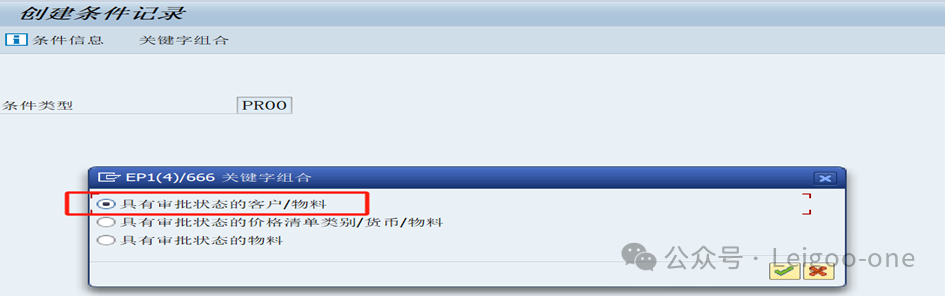 3、維護銷售價格VK11 在前臺輸入VK11,在條件類型欄輸入PR00,按回車鍵或點擊”關(guān)鍵字組合”按鈕,選擇第一項“具有審批狀態(tài)的客戶/物料”,維護凈價。 選擇計劃銷售的銷售組織、分銷渠道以及銷售單位,也就是說準(zhǔn)備以什么價格把該物料賣給誰,如圖: