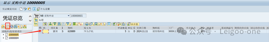第三方銷售的關(guān)鍵點就在這兩個地方,項目類別和計劃行類別,其他的其實都差不多。 保存銷售訂單,標(biāo)準(zhǔn)訂單已保存。自動生成采購申請:VA03;輸入訂單號,執(zhí)行,雙擊行,查看計劃行,生成了采購申請編號10000005。 5、查看采購申請ME53N 輸入事務(wù)碼,找到采購申請編號,如圖所示:
