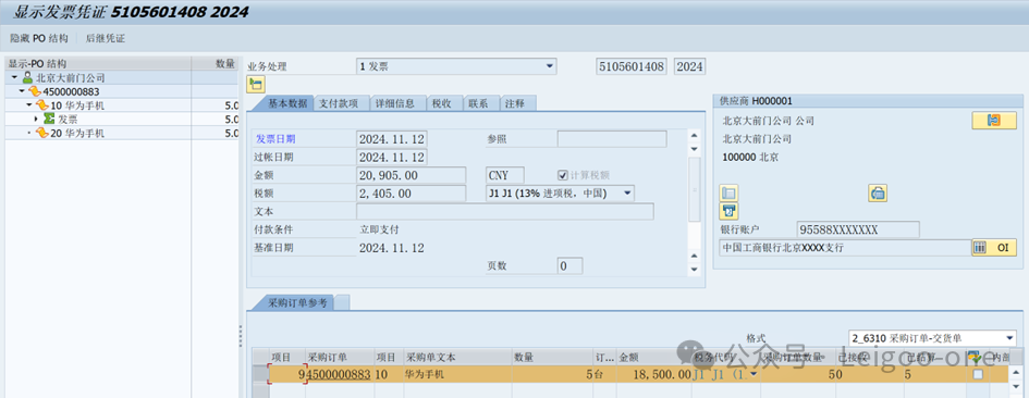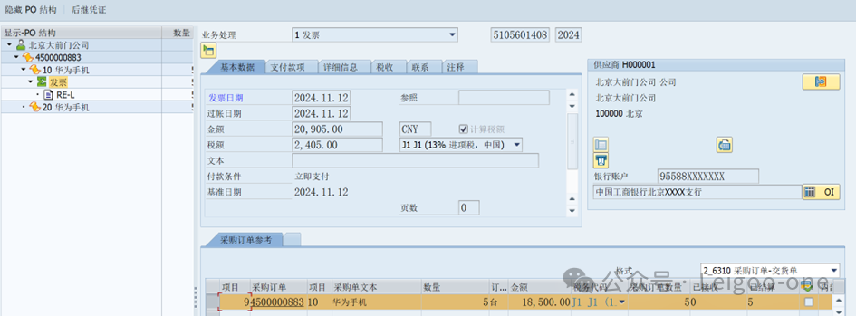保存,生成采購訂單4500000883。 8、采購收票MIRO校驗 因為我們設(shè)置的是不收貨,跳過MIGO收貨這個環(huán)節(jié),直接進入MIRO發(fā)票校驗。選擇采購訂單4500000883,進入一下界面,