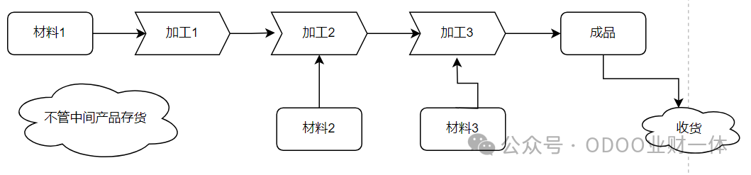 場(chǎng)景2:貿(mào)易公司為客戶(hù)提供產(chǎn)品,除采購(gòu)基本材料后,其余加工業(yè)務(wù)全部都是外包,公司沒(méi)有倉(cāng)庫(kù),也不去核算中間產(chǎn)品,只是核算最終成品的成本。如圖: