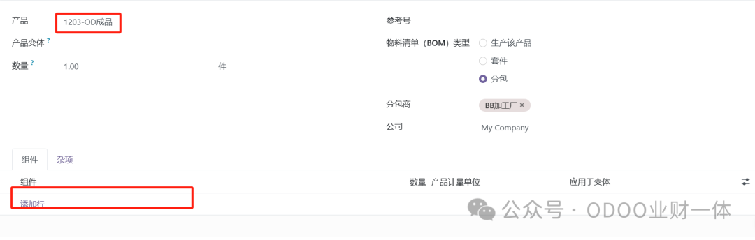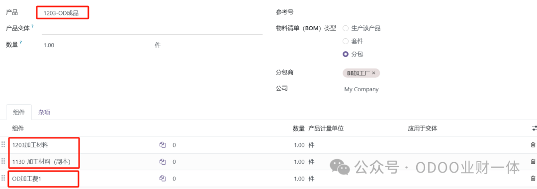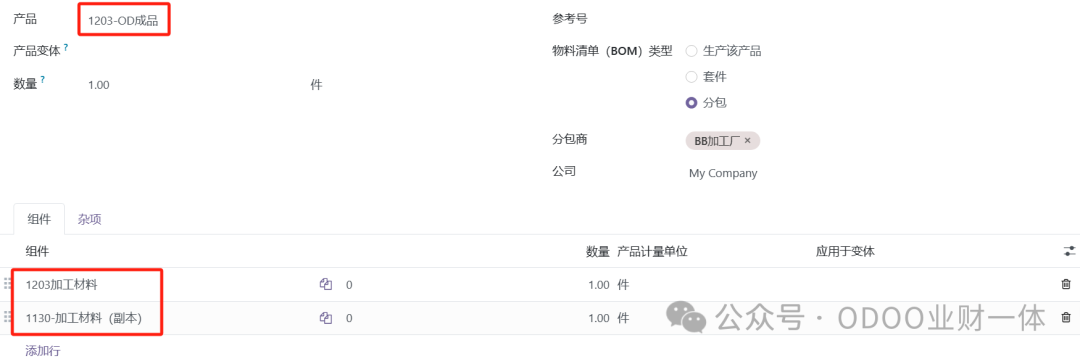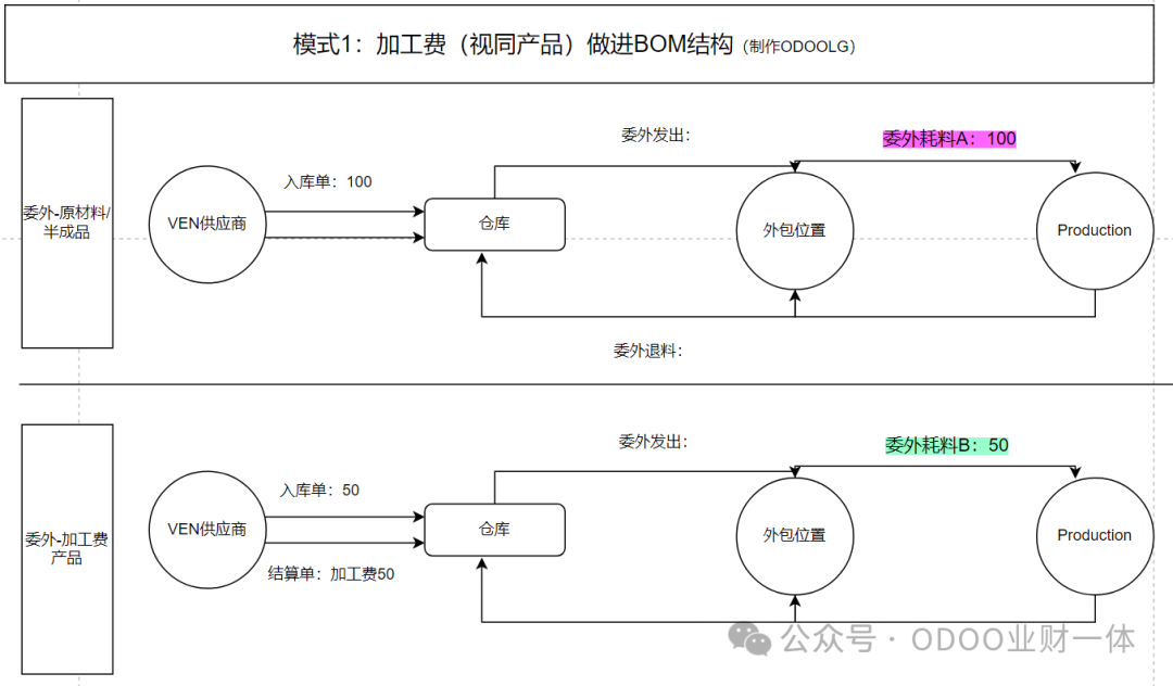 二、ODOO處理委外加工業(yè)務(wù)的3種模式 模式1:加工成品的BOM結(jié)構(gòu) = 材料+加工費(fèi)