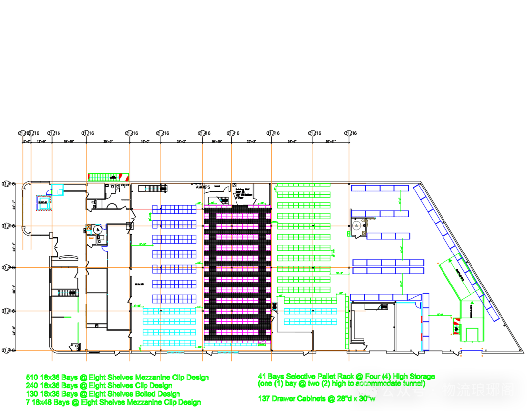 在選擇要設(shè)置的倉庫布局類型時,請在考慮可用空間的同時牢記所有預(yù)期功能。永遠(yuǎn)記住要考慮到未來的增長,這樣才能避免在業(yè)務(wù)開始增長時重新設(shè)計。 最后形成倉庫布局圖: