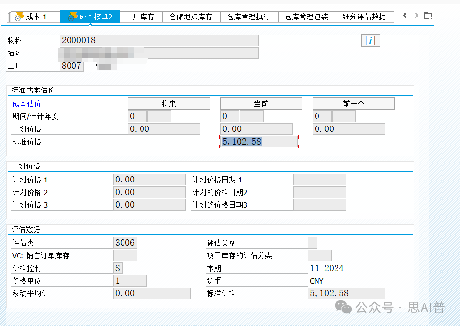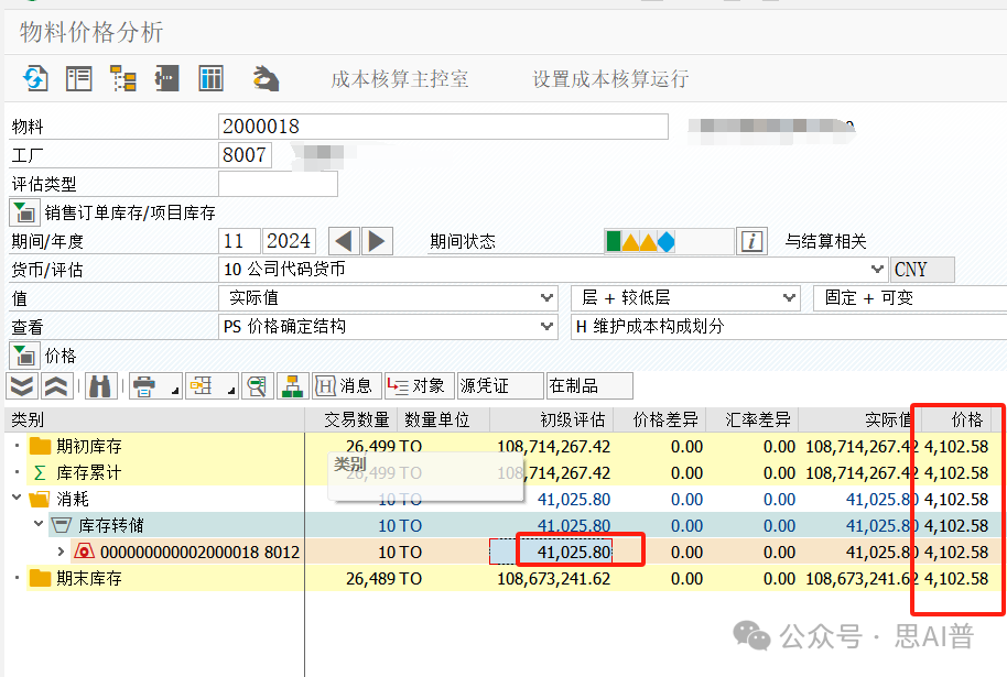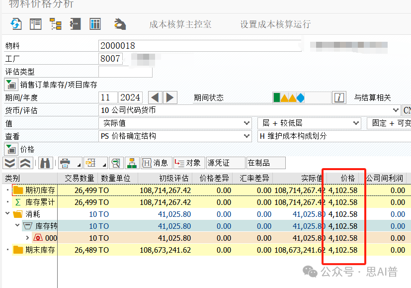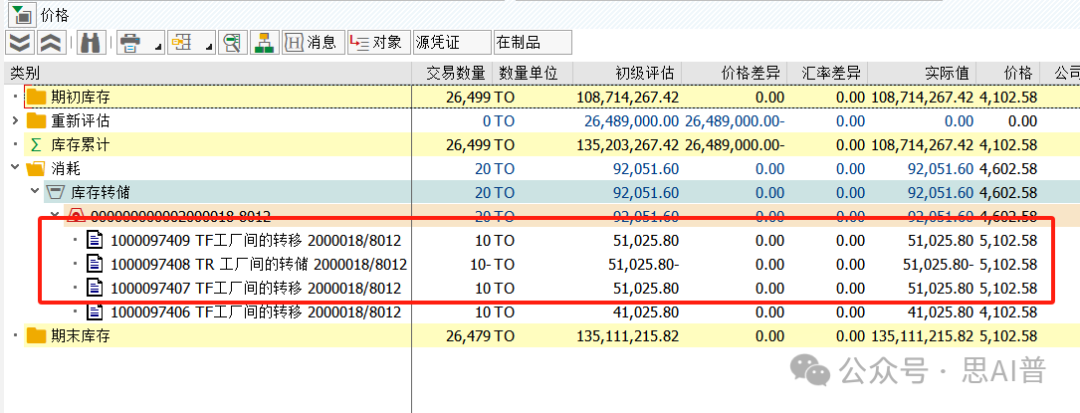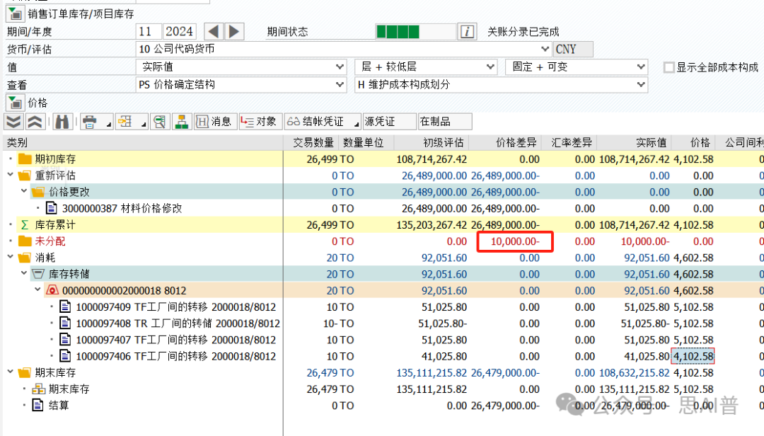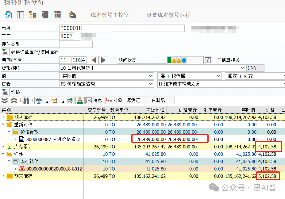 通過CKM3查看,期末庫存的標準價格也就是此時物料的當前標準價格變?yōu)?102.58,更改后的價格 同時因為價格更改產(chǎn)生了差異,調(diào)整實際值。 我們繼續(xù)進行物料移動,價格更改后的物料移動都采用了新的標準價格。