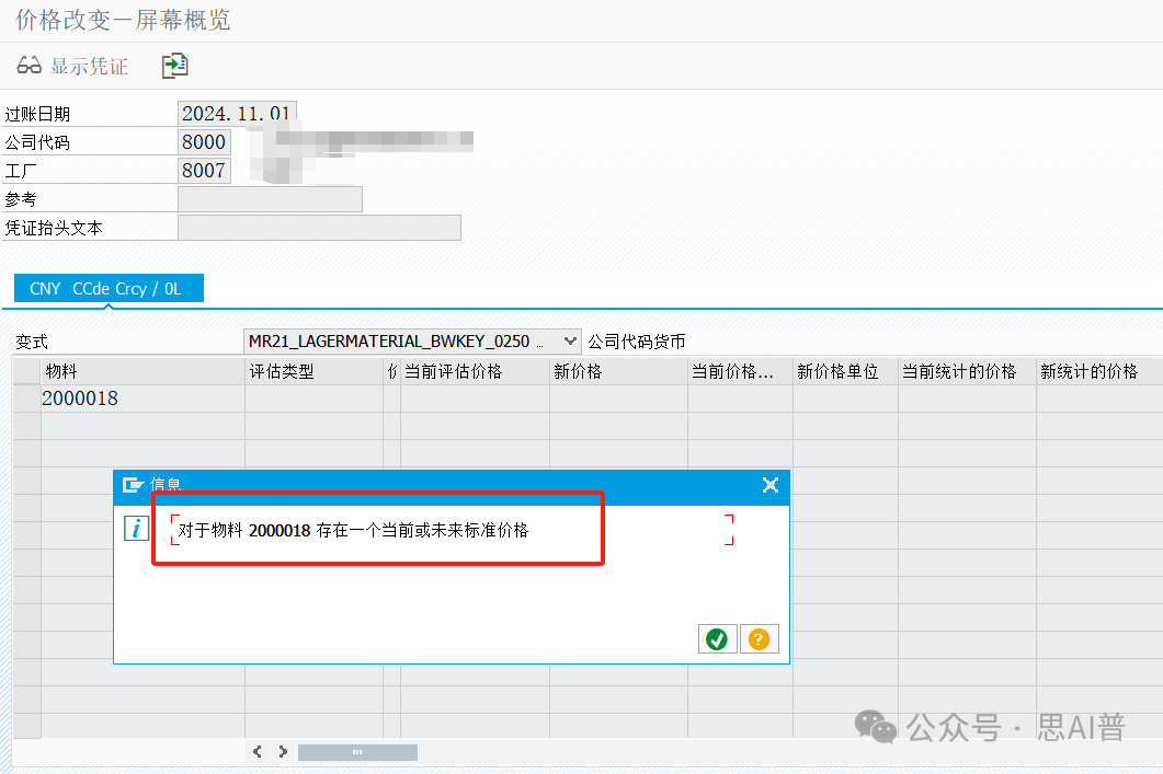 一個物料如果當期有標準價格,進行更改標準價格時系統(tǒng)會提示你 對于物料 2000018 存在一個當前或未來標準價格消息號 CKPRCH025 診斷存在當前或未來成本估算。過程可以通過單選按鈕‘缺省計劃作業(yè)價格’來設(shè)置已標記成本估算價格,且可以通過保存來發(fā)布。