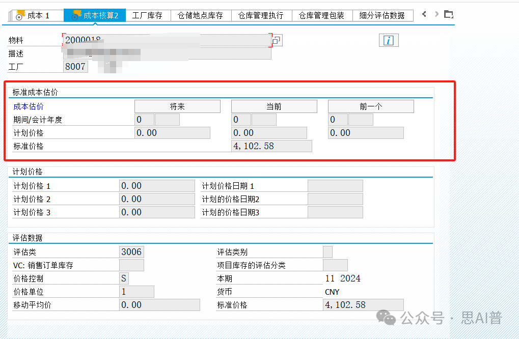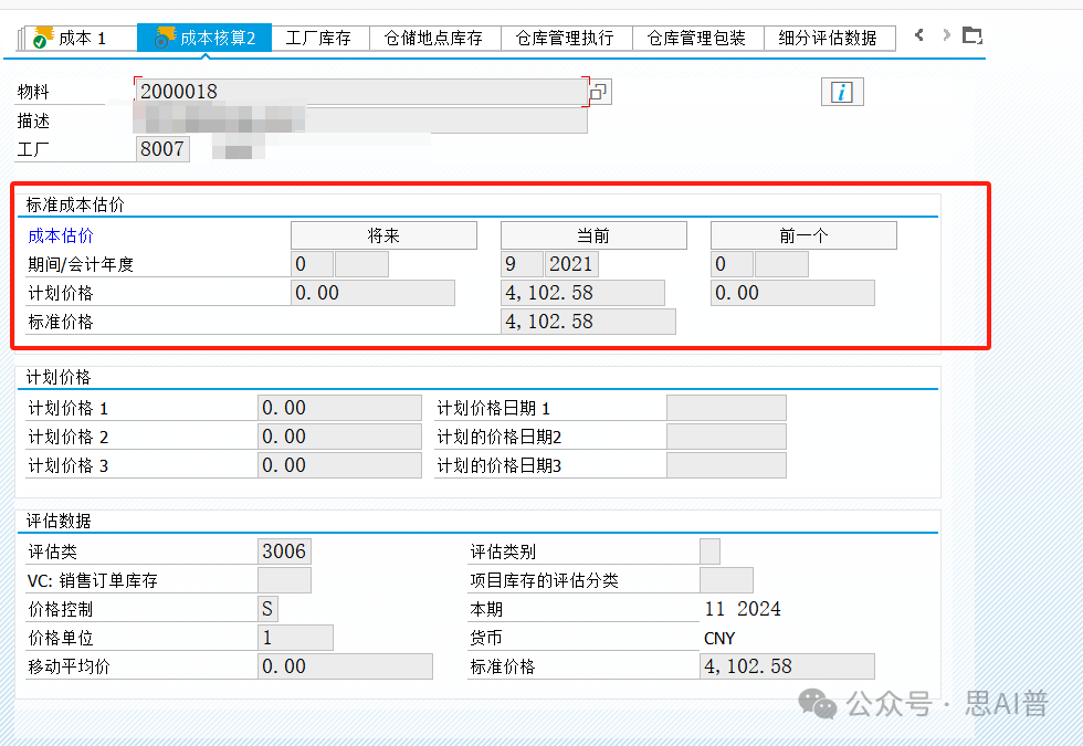 要刪除當前的標準價格則選擇當前的標準成本估算,這里對應(yīng)當MM03物料成本視圖