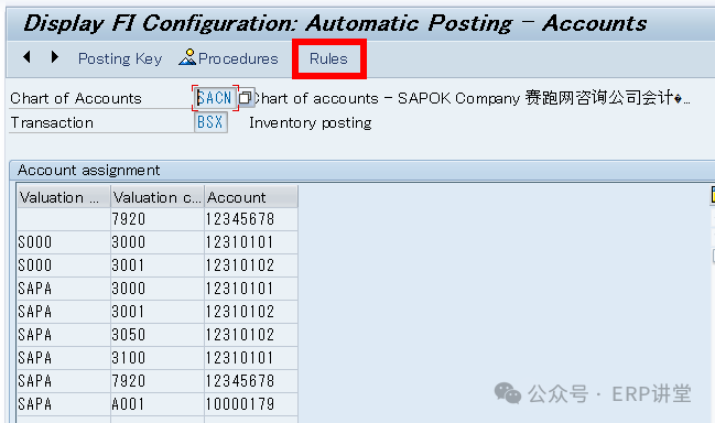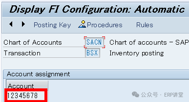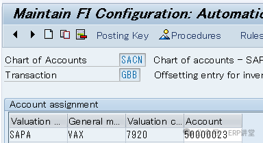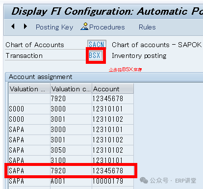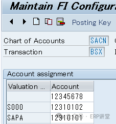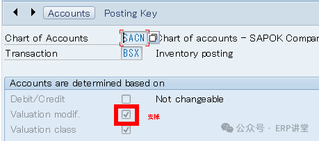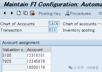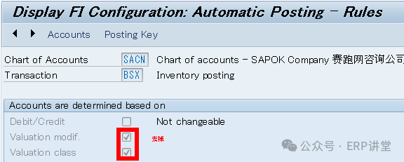這樣對庫存科目有以下幾種配置方案 方案1 整個公司所有類型物料用一個庫存科目 在OBYC中對業(yè)務(wù)碼BSX的規(guī)則估價修改,評估級別都不選