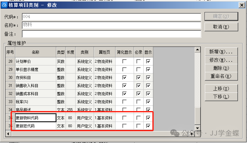 金蝶KIS專業(yè)版上線后,發(fā)現(xiàn)物料代碼長度不夠用,若要調(diào)整長度應(yīng)如何處理? 軟件標(biāo)準(zhǔn)功能不支持批量修改物料代碼,然而客戶的這一需求較為迫切。經(jīng)過對軟件的研究,終于找到一種變通實現(xiàn)的方法,具體解決辦法如下: 1,在金蝶KIS專業(yè)版中為物料增加兩個自定義字段,即“更新物料代碼”和“更新短代碼”(注意字段屬性設(shè)置與物料代碼和短代碼一致);