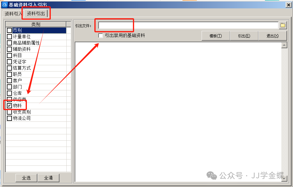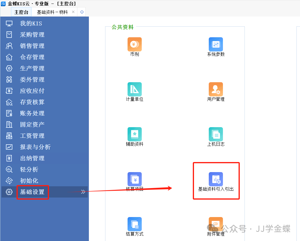 2,在【基礎(chǔ)設(shè)置】-【基礎(chǔ)導(dǎo)入導(dǎo)出】里,將金蝶KIS專業(yè)版中的物料導(dǎo)出為Excel文件;