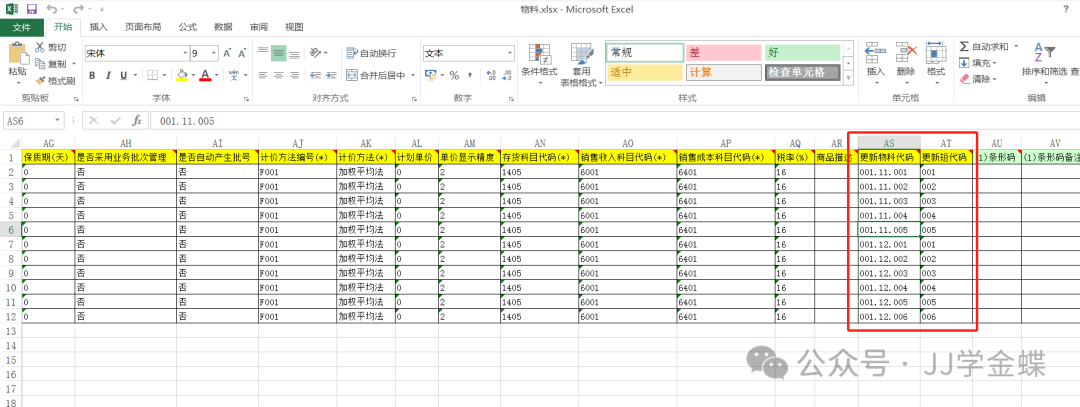 3,在Excel中手工維護(hù)需要修改的物料的“更新物料代碼”和“更新短代碼”字段信息;