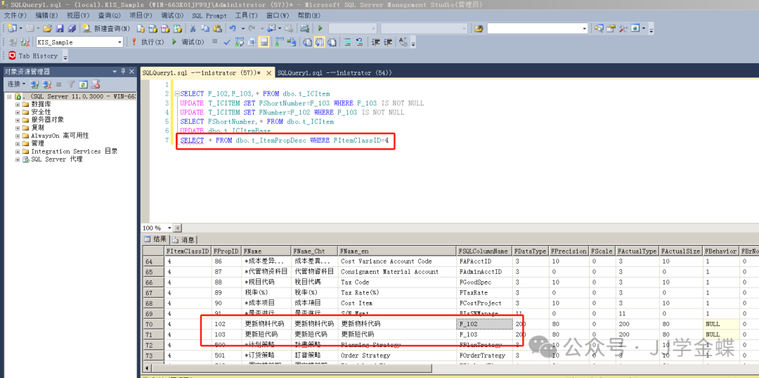 5,前往SSMS控制臺通過語句更新t_Item和t_ICItem。 登錄SSM控制臺通過語句查看新增字段的名字為F_102和F_103: SELECT * FROM dbo.t_ItemPropDesc WHERE FItemClassID=4