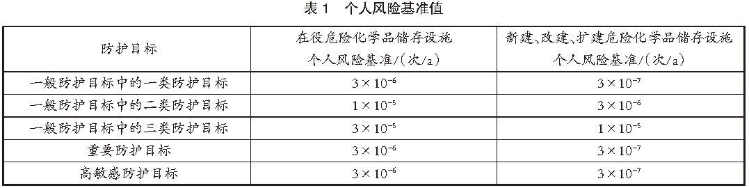 我國是集裝箱進(jìn)出口大國,上海港、寧波舟山港、青島港等主要沿海集裝箱港口的年吞吐量均在世界港口中位于前列。由于集裝箱運(yùn)輸?shù)母咝院捅憷裕澜缟铣^70%的危險(xiǎn)化學(xué)品均通過集裝箱進(jìn)行海上運(yùn)輸。因此,我國的集裝箱堆場特別是危險(xiǎn)貨物集裝箱堆場數(shù)量規(guī)模也相對較大。不同于國外一些港口(例如比利時(shí)安特衛(wèi)普港、新加坡港等)采用危險(xiǎn)貨物集裝箱與普通貨物集裝箱混合堆存的方式,我國危險(xiǎn)貨物集裝箱一般堆存在危險(xiǎn)貨物集裝箱專用堆場內(nèi)。雖然我國相關(guān)標(biāo)準(zhǔn)規(guī)范對危險(xiǎn)貨物集裝箱堆場的安全距離、堆存方式等作出了規(guī)定,在一定程度上減少了“多米諾”效應(yīng)發(fā)生的可能性,但大量危險(xiǎn)貨物,特別是種類、性質(zhì)不同的危險(xiǎn)貨物集中堆存,仍容易導(dǎo)致事故發(fā)生后產(chǎn)生連鎖反應(yīng)。近年來,尤其是在天津港“8·12”瑞海公司危險(xiǎn)品倉庫特別重大火災(zāi)爆炸事故發(fā)生后,我國對危險(xiǎn)貨物存儲的監(jiān)管方面日趨嚴(yán)格,危險(xiǎn)貨物集裝箱堆場數(shù)量總體呈減少趨勢,但危險(xiǎn)貨物集裝箱的業(yè)務(wù)量和堆存需求卻在增加。這就導(dǎo)致為滿足堆存安全性的相關(guān)要求,分類分區(qū)、間隔存放的危險(xiǎn)貨物集裝箱堆存方式可能會造成堆場存放空間不足。2022年12月1日實(shí)施的《港口作業(yè)安全要求第3部分:危險(xiǎn)貨物集裝箱》(GB 16994.3—2021)第7.7條提出:“裝載GB 6944—2012中8類、9類固態(tài)危險(xiǎn)貨物的集裝箱,當(dāng)所載貨物無副危險(xiǎn)性,包裝類非I、II類且不屬于危險(xiǎn)化學(xué)品時(shí),可與普通貨物集裝箱混堆?!痹摋l款適用范圍僅為8類、9類的固態(tài)危險(xiǎn)貨物,且存在諸多限制條件和堆存要求,其他危險(xiǎn)性較高的危險(xiǎn)貨物仍存在堆存問題。因此,針對我國危險(xiǎn)貨物集裝箱堆場的現(xiàn)狀和集裝箱堆場企業(yè)所存在的問題和實(shí)際周轉(zhuǎn)需求,提出一種基于國內(nèi)港口風(fēng)險(xiǎn)基準(zhǔn)要求的危險(xiǎn)貨物集裝箱堆存方案優(yōu)化方法。1.1 港口風(fēng)險(xiǎn)基準(zhǔn)要求根據(jù)《危險(xiǎn)化學(xué)品生產(chǎn)裝置和儲存設(shè)施風(fēng)險(xiǎn)基準(zhǔn)》(GB 36894—2018)的規(guī)定可知:個(gè)人風(fēng)險(xiǎn)是指人員無任何防護(hù)長時(shí)間處于某個(gè)場所,受到危險(xiǎn)化學(xué)品事故影響而死亡的頻率;社會風(fēng)險(xiǎn)是指發(fā)生大于等于N人群體死亡的事故累計(jì)頻率,即在危險(xiǎn)區(qū)域的企業(yè)員工和社會公眾發(fā)生某種傷害的頻次,用累計(jì)頻率(F)和死亡人數(shù)(N)曲線(F-N曲線)圖來表示。根據(jù)交通運(yùn)輸部《港口危險(xiǎn)貨物重大危險(xiǎn)源監(jiān)督管理辦法》(交水規(guī)〔2021〕6號)第6條規(guī)定:構(gòu)成一級、二級港口重大危險(xiǎn)源的,港口經(jīng)營人應(yīng)當(dāng)委托第三方,按照《危險(xiǎn)化學(xué)品生產(chǎn)裝置和儲存設(shè)施風(fēng)險(xiǎn)基準(zhǔn)》(GB 36894)的要求,采用定量風(fēng)險(xiǎn)評價(jià)方法確定個(gè)人和社會風(fēng)險(xiǎn)值。如果通過定量風(fēng)險(xiǎn)評價(jià)方法得出的個(gè)人或社會風(fēng)險(xiǎn)值超出標(biāo)準(zhǔn)規(guī)定的風(fēng)險(xiǎn)基準(zhǔn),則港口經(jīng)營人需要采取有效的管控措施來降低相應(yīng)風(fēng)險(xiǎn)值,使其符合風(fēng)險(xiǎn)基準(zhǔn)的要求。1.2 個(gè)人風(fēng)險(xiǎn)基準(zhǔn)值基于前述可知,危險(xiǎn)貨物港口經(jīng)營人的風(fēng)險(xiǎn)基準(zhǔn)是按照《危險(xiǎn)化學(xué)品生產(chǎn)裝置和儲存設(shè)施風(fēng)險(xiǎn)基準(zhǔn)》的要求執(zhí)行的,港口經(jīng)營人儲存設(shè)施周圍的防護(hù)目標(biāo)個(gè)人風(fēng)險(xiǎn)值不能超過其中的個(gè)人風(fēng)險(xiǎn)基準(zhǔn)。由于計(jì)算危險(xiǎn)貨物堆場的安全容量,針對的是已經(jīng)建成的在役儲存裝置進(jìn)行計(jì)算,因此,進(jìn)行堆場安全容量計(jì)算時(shí)采用的個(gè)人風(fēng)險(xiǎn)基準(zhǔn)值不應(yīng)超過標(biāo)準(zhǔn)中的在役危險(xiǎn)化學(xué)品儲存設(shè)施個(gè)人風(fēng)險(xiǎn)基準(zhǔn)。《危險(xiǎn)化學(xué)品生產(chǎn)裝置和儲存設(shè)施風(fēng)險(xiǎn)基準(zhǔn)》對儲存設(shè)施周邊的一般防護(hù)目標(biāo)中的一類、二類、三類防護(hù)目標(biāo)和重要、高敏感防護(hù)目標(biāo)的個(gè)人風(fēng)險(xiǎn)基準(zhǔn)均進(jìn)行了具體規(guī)定。個(gè)人風(fēng)險(xiǎn)基準(zhǔn)值見表1。