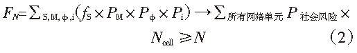 式中:R為網(wǎng)格點(diǎn)處的個(gè)人風(fēng)險(xiǎn);fS為泄漏場景發(fā)生頻率;PM為天氣概率;Pφ為風(fēng)向概率;Pi為點(diǎn)火概率;P個(gè)體風(fēng)險(xiǎn)為網(wǎng)格點(diǎn)的死亡概率。個(gè)人風(fēng)險(xiǎn)通常以個(gè)人風(fēng)險(xiǎn)等值線表示,將相同個(gè)人風(fēng)險(xiǎn)的網(wǎng)格點(diǎn)相連繪制成個(gè)人風(fēng)險(xiǎn)等值線,與表1中的個(gè)人風(fēng)險(xiǎn)基準(zhǔn)進(jìn)行比對,得出個(gè)人風(fēng)險(xiǎn)是否可接受的結(jié)論。2.3 社會風(fēng)險(xiǎn)計(jì)算模型在計(jì)算社會風(fēng)險(xiǎn)時(shí),在個(gè)人風(fēng)險(xiǎn)計(jì)算確定的各泄漏場景、天氣等級(M)、風(fēng)向(φ)、點(diǎn)火事件(i)的基礎(chǔ)上,確定網(wǎng)格點(diǎn)內(nèi)的人數(shù)Ncell,得到對應(yīng)的網(wǎng)格點(diǎn)的人口死亡百分比(P社會風(fēng)險(xiǎn))。計(jì)算死亡總?cè)藬?shù)(∑所有網(wǎng)格單元P社會風(fēng)險(xiǎn)×Ncell)≥N的所有事故發(fā)生的頻率(FN),并進(jìn)一步構(gòu)造社會風(fēng)險(xiǎn)F-N曲線,根據(jù)F-N曲線所處區(qū)域,與圖2社會風(fēng)險(xiǎn)基準(zhǔn)進(jìn)行比對,得出社會風(fēng)險(xiǎn)是否可接受的結(jié)論。社會風(fēng)險(xiǎn)計(jì)算公式為
