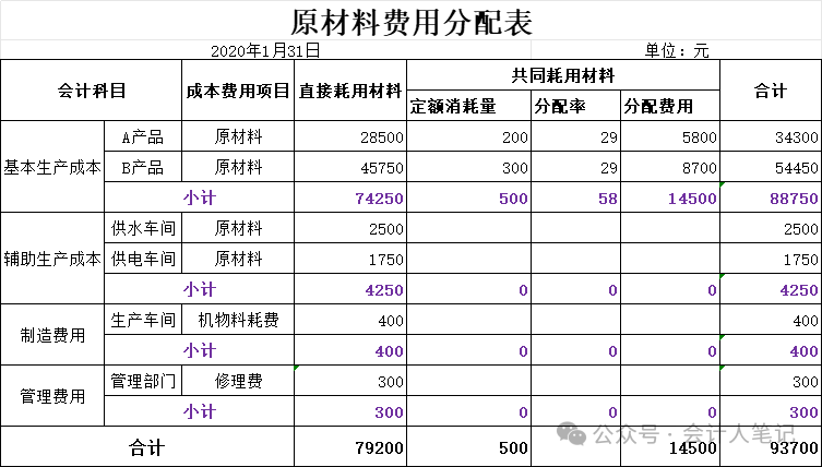 三、完工產(chǎn)品成本匯總表的編制在編制完材料費(fèi)用分配表后,企業(yè)還需要編制完工產(chǎn)品成本匯總表,以反映各產(chǎn)品的總成本和單位成本。完工產(chǎn)品成本匯總表應(yīng)包括直接材料、直接人工和制造費(fèi)用等成本項(xiàng)目。 以牛氏股份有限公司為例,假設(shè)本月A產(chǎn)品的直接人工費(fèi)用為3000元,制造費(fèi)用為2000元;B產(chǎn)品的直接人工費(fèi)用為4500元,制造費(fèi)用為3000元。則A產(chǎn)品的總成本為5800(直接材料)+3000(直接人工)+2000(制造費(fèi)用)=10800元,單位成本為10800/200=54元/件;B產(chǎn)品的總成本為8700(直接材料)+4500(直接人工)+3000(制造費(fèi)用)=16200元,單位成本為16200/150=108元/件。 最后這個(gè)完工產(chǎn)品匯總表留給在座的各位,感興趣的可以評論區(qū)留言