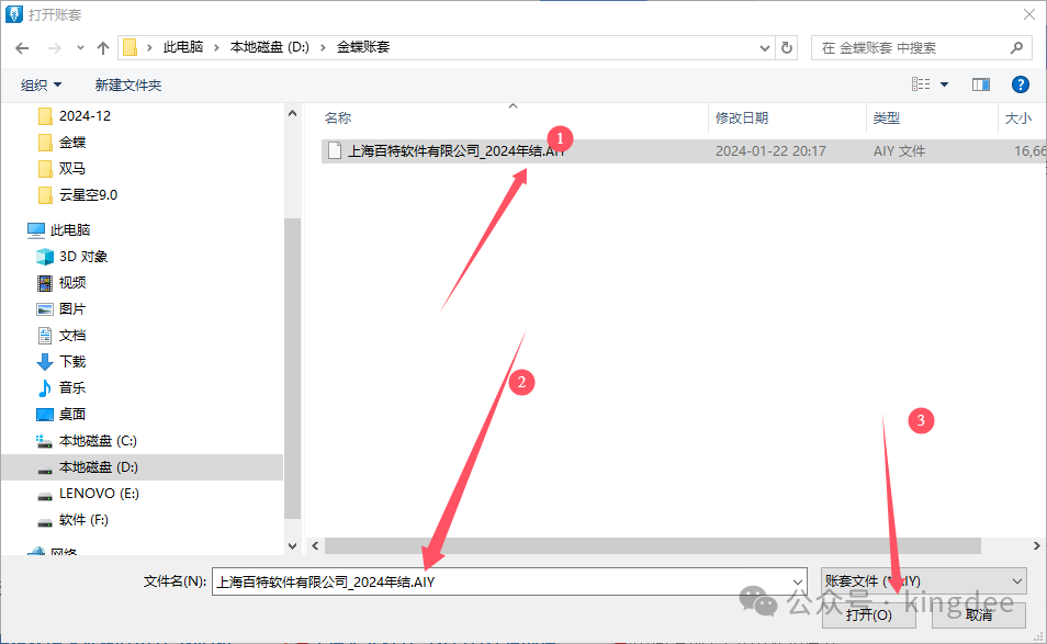 2.4) 年結(jié)完成后,賬套會計期間會自動變成下一會計年度第一期間,查看金蝶軟件右下角顯示的會計期間為2025年1期。 上個年度的數(shù)據(jù)系統(tǒng)會根據(jù)會計年度自動生成一個后綴為AIY的年結(jié)文件,如是2024年年結(jié)生成的年結(jié)文件就是XXX公司2024.AIY。 3、如果需要查看之前年度的數(shù)據(jù),打開年結(jié)文件進(jìn)行查看,有2個路徑 (1)進(jìn)入賬套后,右上角文件下有打開年結(jié)賬套,選擇對應(yīng)的年結(jié)文件打開,選擇XXX公司2024.AIY,打開即可
