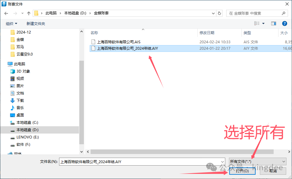 (2)在產(chǎn)品打開的登陸界面也可以選擇年結(jié)賬套進(jìn)行打開,打開賬套文件夾后,右下角文件格式選擇所有格式,就可以看到年結(jié)文件了,選擇打開就可以了
