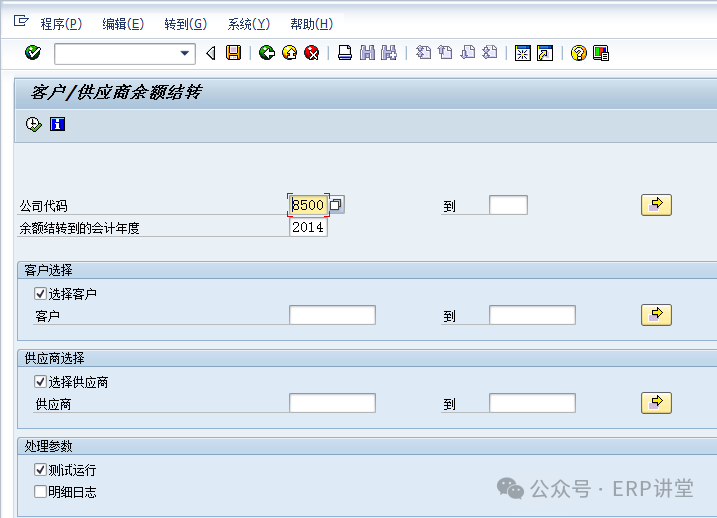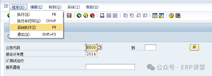 (2)輸入公司代碼和會(huì)計(jì)年度,測(cè)試運(yùn)行。