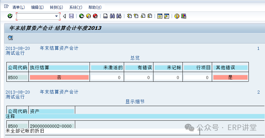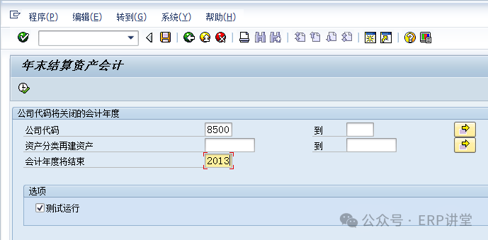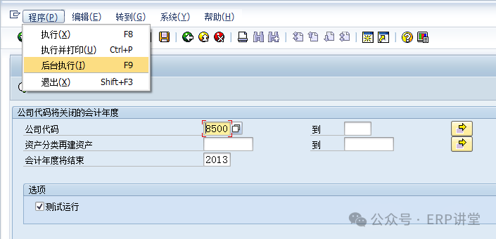 (2)選擇公司代碼、結(jié)束的會(huì)計(jì)年度后,點(diǎn)擊測(cè)試運(yùn)行: