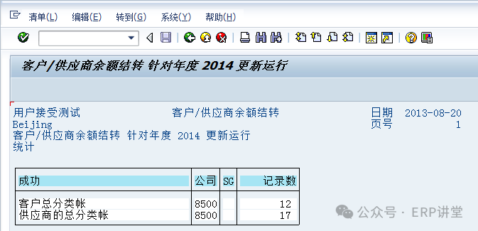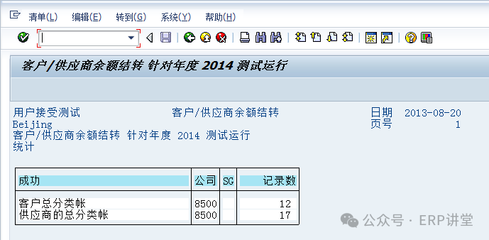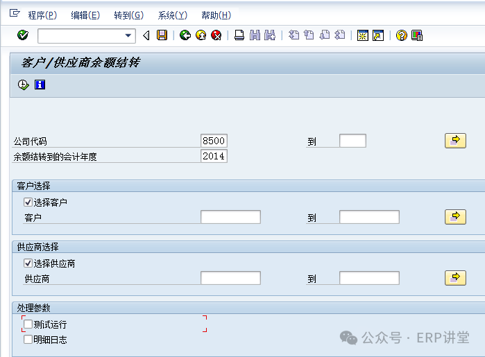 點(diǎn)擊按鈕,退回到初始界面,取消選擇“測(cè)試運(yùn)行”后正式運(yùn)行即可。 1.1.4.4結(jié)論總賬余額結(jié)轉(zhuǎn)至下一會(huì)計(jì)年度。 1.1.4.5備注1.1.5系統(tǒng)操作—應(yīng)收應(yīng)付往來(lái)余額結(jié)轉(zhuǎn)1.1.5.1操作范例應(yīng)收應(yīng)付科目余額結(jié)轉(zhuǎn)至下一會(huì)計(jì)年度。 在年結(jié)時(shí),需要對(duì)應(yīng)收應(yīng)付的余額進(jìn)行結(jié)轉(zhuǎn)到下一年度,通過(guò)結(jié)轉(zhuǎn),在下一年的相應(yīng)報(bào)表中有相應(yīng)的期初余額。 1.1.5.2系統(tǒng)菜單及事務(wù)代碼