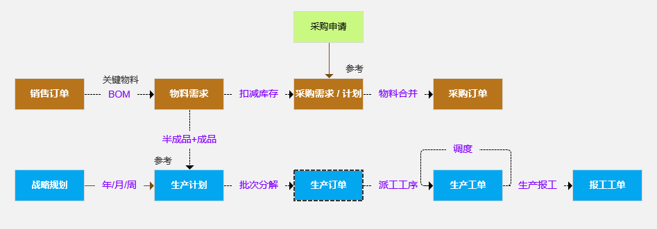 關(guān)于生產(chǎn)制造,有很多的名詞,每個名詞代表了具體的模塊或功能。如:生產(chǎn)計(jì)劃、物料需求、采購申請、生產(chǎn)工單等等,要理解這些名詞,確定其代表的真實(shí)意義,我們需要梳理清楚完整的生產(chǎn)制造業(yè)務(wù)流程。 先從工廠的執(zhí)行概況入手,大抵是根據(jù)收到的【銷售訂單】確定【物料需求】,即是依據(jù)賣出去多少制造多少(賣出1W輛車,工廠加緊生產(chǎn)),從而確定向供應(yīng)商買多少原料,發(fā)起【采購訂單】;同時,參考【銷售訂單】的交貨日期(如在明天要交貨1W輛),以及物料庫存、產(chǎn)能計(jì)劃等,確定【生產(chǎn)計(jì)劃】,從而決定各產(chǎn)線每日每班次【生產(chǎn)工單】(如明天必須要生產(chǎn)1W輛),并進(jìn)行報工反饋。 因此,生產(chǎn)制造業(yè)務(wù)有兩條主要的業(yè)務(wù)流程:【銷售訂單】到【采購訂單】,【生產(chǎn)計(jì)劃】到【報工工單】。 ?▲ 業(yè)務(wù)流程概況