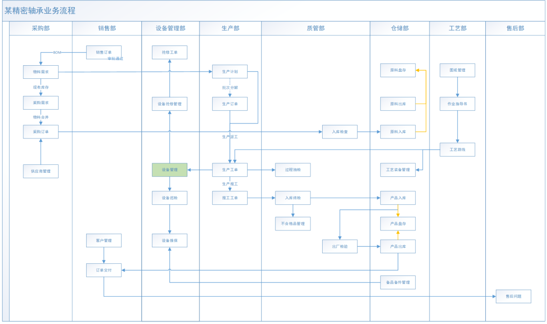 3 業(yè)務(wù)流程分析案例 業(yè)務(wù)分析會產(chǎn)出業(yè)務(wù)流程,流程節(jié)點(diǎn)用現(xiàn)場的真實(shí)表單進(jìn)行校驗(yàn),則完成業(yè)務(wù)分析的自我檢核。 以上部分分析完成:銷售訂單確定,物料需求生成,采購需求申請、采購需訂單生成的物料產(chǎn)品流;完成生產(chǎn)計(jì)劃制定、生產(chǎn)工單執(zhí)行、生產(chǎn)報工反饋的核心業(yè)務(wù)流;共同完成生產(chǎn)制造業(yè)務(wù)流程梳理。 這是一個標(biāo)準(zhǔn)情況,但落實(shí)到具體的項(xiàng)目時,需要結(jié)合客戶的真實(shí)業(yè)務(wù)情況。 首先需要變化注意的是,客戶的組織架構(gòu)是否包含銷售部、采購部、生產(chǎn)部、倉儲部,否則對應(yīng)的業(yè)務(wù)執(zhí)行需要重新歸置; ▲ 某精密軸承業(yè)務(wù)流程 其次是,這幾個部分的數(shù)據(jù)流是否有強(qiáng)關(guān)聯(lián)關(guān)系,在相對較小的生產(chǎn)企業(yè),可以直接下發(fā)【生產(chǎn)工單】,來了訂單就直接做,沒有訂單就歇著;這也再次凸顯系統(tǒng)要為業(yè)務(wù)服務(wù)。 但是這個增減,是因?yàn)榱私鈽?biāo)準(zhǔn)情況是怎樣的,甚至是從簡到繁的發(fā)展路徑,這樣流程的增減也就有了依據(jù),知其然知其所以然。 梳理完成生產(chǎn)制造業(yè)務(wù)流程,也就摸清楚了MES系統(tǒng)的核心架構(gòu),為下一次MES的深度解析奠定基礎(chǔ)。 閱讀原文:原文鏈接 點(diǎn)晴模切ERP更多信息:http://moqie.clicksun.cn,聯(lián)系電話:4001861886 該文章在 2025/1/23 9:46:45 編輯過 |