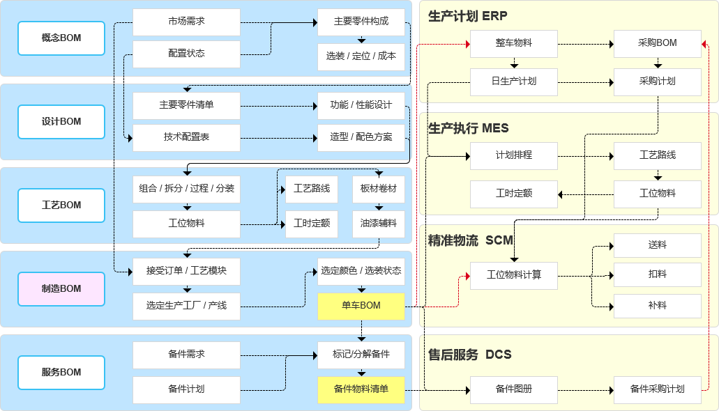 在生產(chǎn)計劃環(huán)節(jié):BOM為生產(chǎn)計劃提供數(shù)據(jù)支持 通過BOM數(shù)據(jù),企業(yè)可以清晰地了解生產(chǎn)每個產(chǎn)品所需的所有物料,含原材料、零部件、輔料等。詳細的物料清單不僅確保了生產(chǎn)計劃的準確性,還避免了因物料短缺或過剩導致的生產(chǎn)延誤和成本浪費。 BOM還可以根據(jù)生產(chǎn)需求的變化,及時調(diào)整生產(chǎn)計劃,確保生產(chǎn)流程的順暢進行。 在原材料采購環(huán)節(jié):為采購部門提供明確的采購清單 BOM可以詳細列出生產(chǎn)所需的各種原材料和零部件、及其比例關系,為采購部門生成明確的采購清單,準確地計算出所需原材料的數(shù)量和規(guī)格,從而進行有針對性的采購。 BOM還可以與供應商管理系統(tǒng)集成,實現(xiàn)原材料采購的自動化和智能化,提高采購效率和降低采購成本。 在生產(chǎn)用料方面:通過BOM表單估算范圍,來進行資源的合理配置 通過BOM表單,可以捕捉所有有用數(shù)據(jù),進行成本估算,能夠根據(jù)BOM表單估算范圍,來進行資源的合理配置。 從而有效減少浪費,降低成本。 BOM 還可以將復雜的生產(chǎn)流程拆分到每個組件,從而能夠使得生產(chǎn)更加有條理,從每個組件、配料就開始進行質(zhì)量控制。 在庫存管理方面:幫助企業(yè)制定合理的庫存水平 通過精確的物料需求計劃(MRP),BOM可預測出未來一段時間內(nèi)企業(yè)所需的物料數(shù)量,從而幫助企業(yè)制定合理的庫存水平。 這有助于企業(yè)降低庫存成本,減少資金占用,同時確保物料供應的及時性和穩(wěn)定性。 BOM還可以輔助監(jiān)控庫存狀態(tài),預警庫存短缺或過剩的情況,幫助企業(yè)及時采取應對措施。 在產(chǎn)品生命周期管理方面:支持產(chǎn)品從設計到報廢的整個生命周期管理 在產(chǎn)品設計階段:BOM管理系統(tǒng)可以幫助企業(yè)制定詳細的產(chǎn)品物料清單和成本估算; 在生產(chǎn)階段:BOM管理系統(tǒng)可以確保生產(chǎn)過程的順利進行和物料供應的及時性; 在售后服務階段:BOM管理系統(tǒng)可以幫助企業(yè)跟蹤產(chǎn)品變更和維修記錄等信息。這有助于企業(yè)實現(xiàn)產(chǎn)品信息的全面掌控和持續(xù)優(yōu)化產(chǎn)品的設計、生產(chǎn)和服務流程。