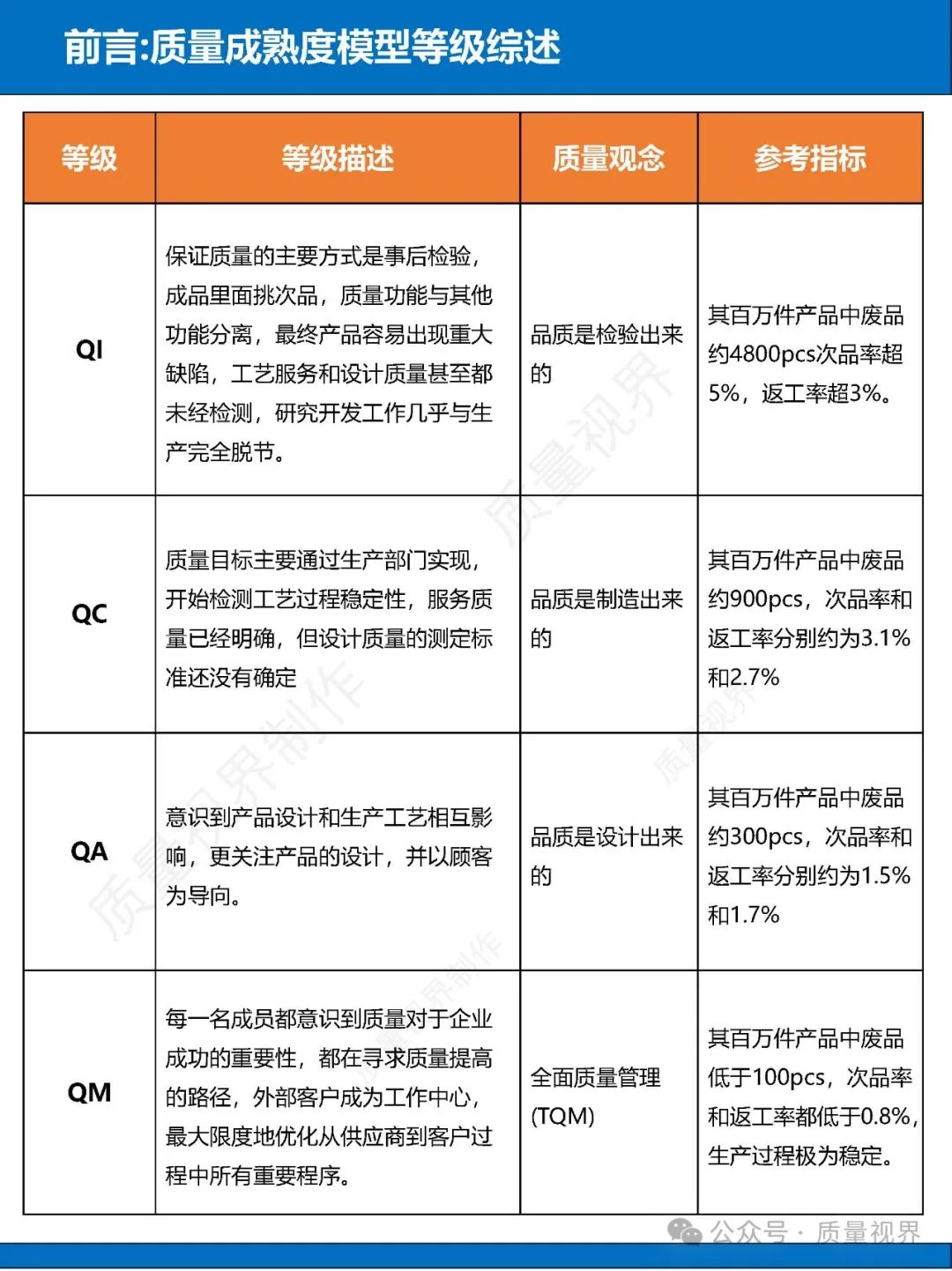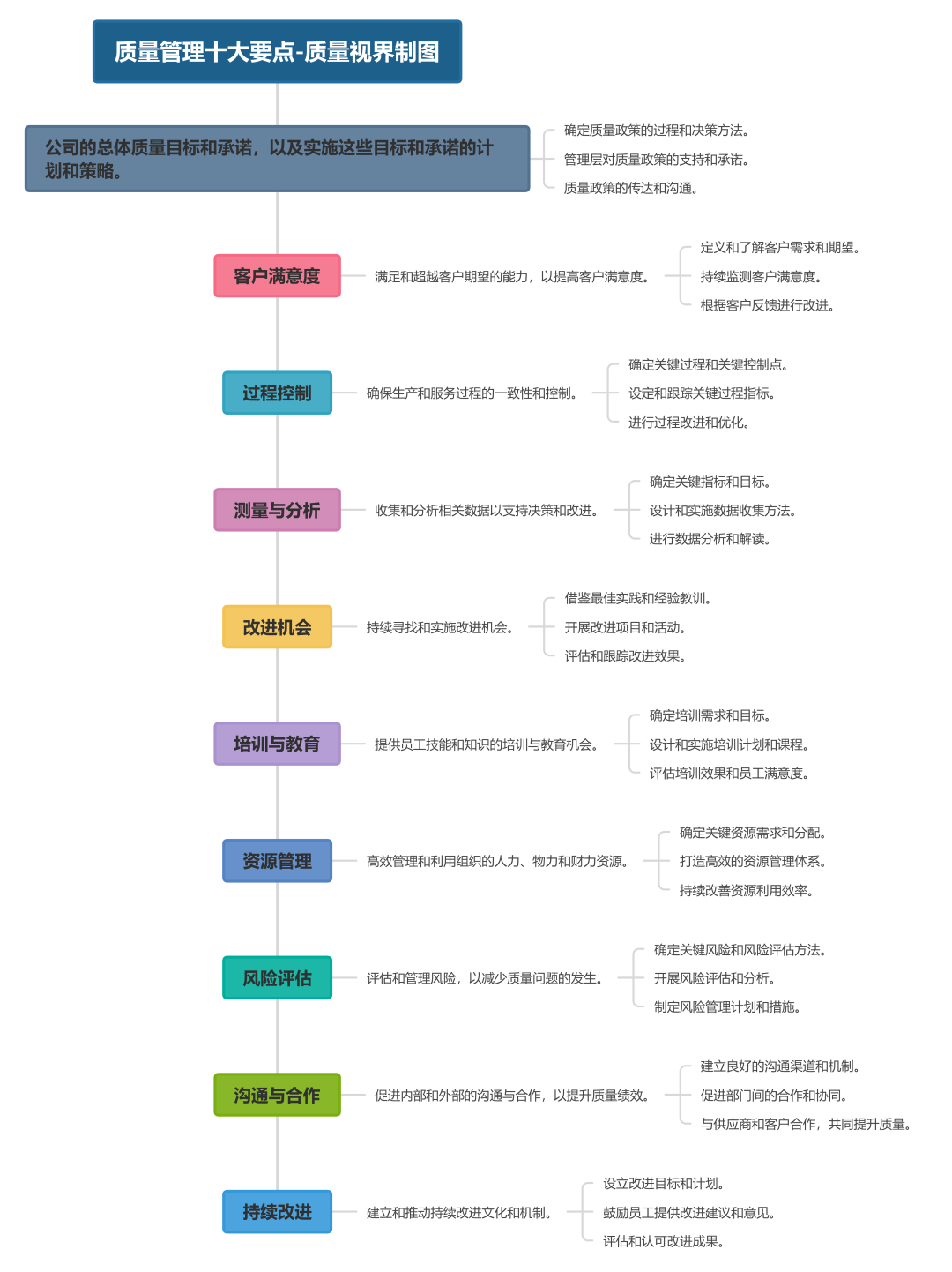 在當(dāng)今競(jìng)爭(zhēng)激烈、市場(chǎng)環(huán)境瞬息萬(wàn)變的商業(yè)版圖中,產(chǎn)品與服務(wù)質(zhì)量宛如企業(yè)的生命線,牢牢把控著企業(yè)興衰存亡的命脈。而處于質(zhì)量管理核心位置的質(zhì)量人,肩負(fù)著保障質(zhì)量水準(zhǔn)、推動(dòng)質(zhì)量提升的重任,在這場(chǎng)質(zhì)量捍衛(wèi)戰(zhàn)里,系統(tǒng)思維成為其不可或缺的 “秘密武器”。本文介紹質(zhì)量管理4個(gè)等級(jí)、7大原則、10個(gè)基本思維方式、12個(gè)步驟、15個(gè)基本原理,每一條都是管理精髓。 01 質(zhì)量的4個(gè)等級(jí) 02 質(zhì)量管理的7大原則 質(zhì)量管理的七大原則是以顧客為關(guān)注焦點(diǎn)、領(lǐng)導(dǎo)作用、全員參與、過(guò)程方法、改進(jìn)、循證決策、關(guān)系管理 ,以下是對(duì)這些原則的詳細(xì)闡述: 1、以顧客為關(guān)注焦點(diǎn):深入了解顧客需求,包括潛在需求。例如蘋(píng)果公司通過(guò)不斷創(chuàng)新產(chǎn)品功能和提升用戶體驗(yàn),滿足了消費(fèi)者對(duì)于便捷、高效和高品質(zhì)電子產(chǎn)品的需求。確保組織的目標(biāo)與顧客需求和期望相結(jié)合,將顧客滿意度作為衡量工作成效的重要指標(biāo)。 2、領(lǐng)導(dǎo)作用:領(lǐng)導(dǎo)者要為組織制定清晰的質(zhì)量方針和質(zhì)量目標(biāo),指明發(fā)展方向。如華為的任正非提出了 “以客戶為中心,以?shī)^斗者為本” 的核心價(jià)值觀,引領(lǐng)華為在全球通信和科技領(lǐng)域取得巨大成功。 3、全員參與:為員工提供必要的培訓(xùn)和資源,使他們具備相應(yīng)的能力和知識(shí),以勝任質(zhì)量管理工作。比如一些制造企業(yè)會(huì)定期組織員工參加生產(chǎn)技能和質(zhì)量管理培訓(xùn)課程。建立激勵(lì)機(jī)制,鼓勵(lì)員工積極參與質(zhì)量改進(jìn)活動(dòng),對(duì)表現(xiàn)優(yōu)秀的員工給予獎(jiǎng)勵(lì)和認(rèn)可。 4、過(guò)程方法:識(shí)別和確定組織內(nèi)的關(guān)鍵過(guò)程,例如產(chǎn)品設(shè)計(jì)開(kāi)發(fā)過(guò)程、生產(chǎn)制造過(guò)程、售后服務(wù)過(guò)程等。對(duì)每個(gè)過(guò)程進(jìn)行策劃、實(shí)施、檢查和改進(jìn),即 PDCA 循環(huán),確保過(guò)程的有效性和效率。豐田公司的生產(chǎn)過(guò)程管理就是過(guò)程方法的優(yōu)秀典范,通過(guò)不斷優(yōu)化生產(chǎn)流程,實(shí)現(xiàn)了高質(zhì)量和高效率的生產(chǎn)。 5、改進(jìn):建立持續(xù)改進(jìn)的機(jī)制和文化,鼓勵(lì)員工發(fā)現(xiàn)問(wèn)題并及時(shí)提出改進(jìn)建議。如海爾集團(tuán)的 “日清日高” 管理模式,要求員工每天對(duì)工作進(jìn)行總結(jié)和改進(jìn)。運(yùn)用各種質(zhì)量管理工具和方法,如六西格瑪、精益生產(chǎn)等,對(duì)組織的產(chǎn)品、服務(wù)和管理過(guò)程進(jìn)行持續(xù)改進(jìn)。 6、循證決策:收集和分析與質(zhì)量管理相關(guān)的數(shù)據(jù)和信息,包括顧客反饋、生產(chǎn)數(shù)據(jù)、質(zhì)量檢測(cè)數(shù)據(jù)等。例如電商企業(yè)通過(guò)分析大量的顧客評(píng)價(jià)數(shù)據(jù),來(lái)改進(jìn)產(chǎn)品和服務(wù)質(zhì)量。 7、關(guān)系管理:識(shí)別組織的相關(guān)方,包括供應(yīng)商、合作伙伴、顧客、員工等,并建立良好的溝通和合作關(guān)系。 03 質(zhì)量管理的10個(gè)基本思維方式 04 質(zhì)量管理體系建立和實(shí)施的12個(gè)步驟 05 質(zhì)量管理的15個(gè)基本原理 ? 閱讀原文:原文鏈接 點(diǎn)晴模切ERP更多信息:http://moqie.clicksun.cn,聯(lián)系電話:4001861886 該文章在 2025/1/23 9:24:29 編輯過(guò) |