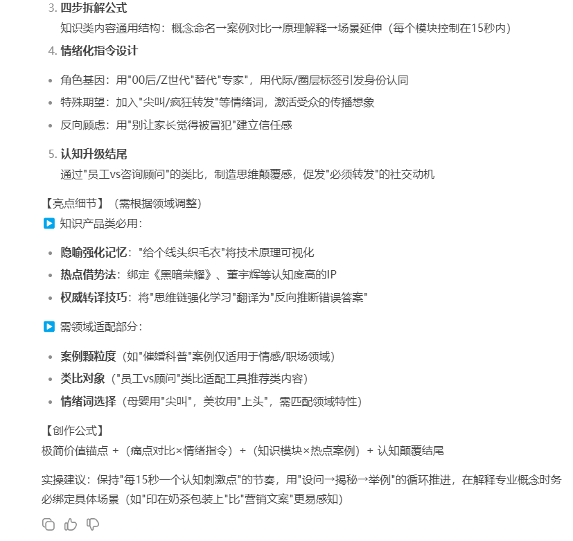 ,贊1.4萬 ![]() ![]() 吸睛文案:Deep Seek的提示詞,學(xué)會這一句就夠了。(①標(biāo)簽文案,指的是點(diǎn)名目標(biāo)用戶。但這條視頻,我沒有特別注明,因為我默認(rèn)所有人在這個時段都關(guān)注DeepSeek;②吸睛文案/黃金3秒:流量詞——DeepSeek,捷徑心理——學(xué)會一句就夠了) 牽制文案:這條極簡提示詞,一共十幾個字,一分鐘就可以搞定,點(diǎn)贊收藏,不管是IP寫內(nèi)容,還是打工人做策劃,都能讓你秒殺所有人,從外行變專家(這里有四點(diǎn):①多加一句話,拉完播,讓用戶更想聽完;②告知只有十幾個字,把學(xué)習(xí)門檻拉低;③提高覆蓋客群,IP和打工人都適用;④中間提醒點(diǎn)贊收藏;⑤最后包裝價值、展示收獲——秒殺所有人,從外行變專家) 觀點(diǎn)文案:這個提示詞就是:角色基因+特殊期望+反向顧慮+細(xì)節(jié)延展(①展示結(jié)構(gòu),讓用戶知道有1234個詞,如果對主題感興趣,不會聽個20秒就劃走;②直接給公式,滿足干貨感的同時,看得懂但不確認(rèn)細(xì)節(jié),想繼續(xù)聽;③熟悉又陌生,知道提示詞要寫角色、寫期望,那基因是啥、特殊是啥) 觀點(diǎn)1:角色基因,指的是我們不需要像以前傳統(tǒng)提示詞那樣,寫個兩三百字,比如你是一個有10年經(jīng)驗的寫作專家,專精于營銷領(lǐng)域,巴拉巴拉。而是要用一些帶有明確基因的專屬詞,比如比如00后、Z時代。(①對標(biāo)傳統(tǒng)AI,提供新知;②直接給操作方案,不復(fù)雜) 作證1:為什么?因為DeepSeek有豐富的語料庫,他知道什么叫Z時代,他知道他們的需求,他們的特點(diǎn),以及他們的風(fēng)格,這個就是角色基因。(給作證,不是我自己瞎說——語料庫) 觀點(diǎn)2:第二個是特殊期望,就是你不要寫給我一條奶茶店的營銷話術(shù),而是你能不能去發(fā)現(xiàn)一個特殊場景,以此去激發(fā)DeepSeek 的靈感和創(chuàng)意。比如給我寫一個讓00后會瘋狂轉(zhuǎn)發(fā)的、印在奶茶包裝上的文案。如果你能想到這樣的場景,把它放入你的特殊期望,你會發(fā)現(xiàn)它給你的答案會比傳統(tǒng)AI高個十倍百倍不止。(提供新知識——1個之前沒想到的問法:印在奶茶包裝上的文案) 這里還有一個關(guān)鍵技巧,就是不管是角色還是期望,你都一定要使用一些情緒詞,比如說讓寶媽尖叫的XXX,或者你是一個美妝行業(yè)的黑話專家,這些聽起來不太正經(jīng)的詞,在傳統(tǒng)AI里面可能是很少見的。(提供新知識:情緒詞——好記好用) 作證2:但DeepSeek很喜歡這些詞,因為它是基于思維鏈強(qiáng)化學(xué)習(xí),自動補(bǔ)全任務(wù)場景。(給作證,不是我自己瞎說——思維鏈) 金句:你給個線頭,它就能幫你織出整件毛衣!(金句加深印象,觸發(fā)點(diǎn)贊) 知識點(diǎn)3+作證3:接下來是反向顧慮,也就是你不想讓它干什么,或者你怕出現(xiàn)什么。因為DeepSeek 有非常強(qiáng)大的推理能力,所以他會從你的顧慮中去反向推斷,幫你排除所有錯誤答案。(給作證,不是我自己瞎說——推理能力) 知識點(diǎn)4+作證4:最后一個是細(xì)節(jié)延展,這個延展可以是輸出風(fēng)格,也可以是輸出形式,比如請用董宇輝的語氣給我寫一個直播稿,或者用執(zhí)行方案的形式輸出你設(shè)計的策劃內(nèi)容,DeepSeek都會給你一個驚艷的答案(簡單舉例,給用戶可以直接上手嘗試的方法) 案例:舉個簡單的例子:你是懂Z時代的心理咨詢師,要給被催婚的女生做科普,要讓她們理解婚姻不是必選項,但是也別讓家長覺得被冒犯,用韓劇《黑暗榮耀》臺詞風(fēng)格來寫(直接給案例,讓用戶能“直接抄”,同時用戶可能想再聽一遍,觸發(fā)完播) 結(jié)尾文案:其實簡單來說,傳統(tǒng)AI更像是你的一個員工,你要事無巨細(xì)的告訴他工作的每一步應(yīng)該如何處理,他才能輸出給你一個相對標(biāo)準(zhǔn)的答案,但是推理型的DeepSeek ,更像是一個24小時的咨詢顧問,你需要給的不是指令,而是精準(zhǔn)的描繪出你的需求場景,它會拆解你的問題,思考它背后的商業(yè)背景,然后進(jìn)行邏輯推演,最后從巨量的知識庫中找到答案。(①升華式結(jié)尾,從“操作方案”上升到“DeepSeek的定位”;②用金句+對比,在結(jié)尾畫龍點(diǎn)睛,讓用戶覺得有道理,增強(qiáng)對視頻的好感——該點(diǎn)贊了) 指令文案:所以,如果我們還在用原來那套提示詞,就是限制了它的發(fā)揮,快轉(zhuǎn)發(fā)給你最好的朋友、同事,一起用起來吧。(①新老AI對比,讓用戶覺得——原來如此;②發(fā)出指令,引導(dǎo)用戶轉(zhuǎn)發(fā)。很多時候你沒說,用戶就真的忘了轉(zhuǎn)發(fā)) 最后還有一點(diǎn),這個不是我刻意為之,但我確認(rèn)肯定有效果,就是:保留一些缺陷,讓用戶在評論區(qū)指出/討論。 1、我錄制這條視頻的時候,比較隨意,是手拿著錄的,所以畫面有各種抖動; 2、我上個月剛開的號,之前沒有短視頻剪輯的經(jīng)驗,背景音樂有點(diǎn)吵 這兩個點(diǎn),在評論區(qū)被很多人嘲諷。反而卻因為這些,與內(nèi)容本身無關(guān)的缺陷,引起了用戶的互動:有人表示同意,說我視頻很爛;有人幫我說話,說人家觀點(diǎn)好就可以了。 所以如果你能想到一些方式,讓用戶在評論區(qū)聊起來、甚至吵起來,也會對你的播放,有很大的影響。 還有一些文案之外的維度,比如:封面設(shè)計如何讓人看到就想點(diǎn)進(jìn)去(因為你的封面會出現(xiàn)在微信推薦和