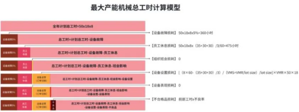 NPV產(chǎn)能計算 在NPV計算過程中有一個極其關(guān)鍵的信息就是產(chǎn)能和工時的計算,其中產(chǎn)能就是要計算新投資的裝配單元一年最多可以生產(chǎn)多少件產(chǎn)品,即最大產(chǎn)能,另外一個就是要計算技術(shù)實際產(chǎn)能工時(TRC)。 最大產(chǎn)能,顧名思義就是要算一年時間內(nèi),生產(chǎn)有效合格產(chǎn)品的最大量。在項目前期進行工藝和投資的評估中,就基本定義好了每件產(chǎn)品的生產(chǎn)工時,所以只要計算出全年生產(chǎn)的總工時,就變成了三年級的工程問題,總工時除以單件工時,就能得到最大產(chǎn)能。 而生產(chǎn)總工時的計算邏輯也很簡單,就是先統(tǒng)籌計算全年排班總時長,然后再減去工人休息,設(shè)備維護,不良品等損耗就是生產(chǎn)總工時,這個就是生產(chǎn)總工時計算的底層邏輯。 1、全年計劃總工時 項目前期規(guī)劃產(chǎn)能的時候,對于任何一臺新設(shè)備或者新線體,最合理的班次排布就是按照一天三班,每周五天,周末雙休的原則,而出于降本增效的考慮,為了能夠更大化的實現(xiàn)投資價值,我們在進行產(chǎn)能評估時,按照一天三班,每周六天,即每周按照18個班次進行設(shè)計。 全年時間去掉假期休息后,全年度約有50個工作周,按照每周18個班次,每班工作8小時計算,最終計算得出單臺設(shè)備的全年計劃總時長為7200小時。 而這7200小時,就相當(dāng)于全年可用于生產(chǎn)的最多的時間,后續(xù)所有的損耗都將在此基礎(chǔ)上進行刪減。 2、損耗:設(shè)備有效利用率 人吃五谷雜糧,總會有頭疼腦熱的時候,設(shè)備也不例外,任何的設(shè)備無論新舊,長時間的運行也會出現(xiàn)各種各樣的故障問題,也就是我們常說的巖機。設(shè)備一旦出現(xiàn)故障,就會停止工作,算好計劃時長。 為了計算這一部分損耗,我們定義了設(shè)備有效利用率(一般為 95%)這樣一個概念: 設(shè)備有效利用率=(計劃總時長-設(shè)備故障總時長)/計劃總時長x100% 去除這部分損耗之后,設(shè)備計劃總時長減掉5%,剩余6840小時。 3、損耗:工人休息時間 工人上班除了吃飯之外,還有用餐時間以及休息時間,對于一些手動裝配單元,當(dāng)人吃飯或休息時,設(shè)備是無法進行生產(chǎn)的,所以也會產(chǎn)生一部分損耗。 對于休息和用餐時間的定義,目前是這樣安排的: 按照每天三班進行排產(chǎn),每天分白/中/夜三班制,白班35min,中班30min,夜班30min。為了便于計算,會將休息時間均分到每個班次內(nèi)求平均值。所以這部分的損耗就是用全年總班次乘每個班次的休息時長,即: 工人休息總時長=50周/年x18班/周x[(35+30+30)/3/60] 注意,如果是自動化設(shè)備在員工休息時依然可以保持工作狀態(tài),這部分損耗可忽略不計。 4、損耗:班會時長 每個班次開始和結(jié)束時間都會有班會的安排,班會期間,操作工人依然無法正常生產(chǎn),勢必會對生產(chǎn)造成影響。 但是為了降低這部分風(fēng)險,我們規(guī)定交接班過程需要保證正常排產(chǎn),方法就是下一班次提前到場,上一班次結(jié)束開班會的時候,下一班次直接入場作業(yè)。這樣就避免班會對生產(chǎn)的影響。所以這一部分損耗為0,忽略不計。 5、損耗:設(shè)備準(zhǔn)備時長 實際生產(chǎn)過程中,都是按照訂單批次進行生產(chǎn)的,每一個批次之間,因為產(chǎn)品型號,加工程序以及工裝夾具的不同,都會有切換,更換程序和相應(yīng)的工襲央具,就像是我們做飯時,炒完一道菜之后,在下道菜之前總是要刷鍋一個道理。 所以設(shè)備準(zhǔn)備時長就是要看一個班次內(nèi)的訂單切換次數(shù),每切換一次都會有一次設(shè)置時間產(chǎn)生。而計算切換次數(shù)就是用單班次生產(chǎn)總數(shù)除以生產(chǎn)批量即可,再往上推計算單班次生產(chǎn)總數(shù),就是用單班次生戶總時長除以單件產(chǎn)品生產(chǎn)時長即可。 其中: 單班次生產(chǎn)總時長 = 計劃時長-休息時長=(8x60-(35+30+30)/3) 單件產(chǎn)品生產(chǎn)時長 = (VMS+VMR/lot size) 所以: 單班次生產(chǎn)總數(shù) = 計劃時長-休息時長=(8x60-(35+30+30)/3)/(VMS+VMR/lot size) 單班次切換次數(shù) = 計劃時長-休息時長(8x60-(35+30+30)/3)/(VMS+VMR/lot size) /lot size 單班次設(shè)備準(zhǔn)備時長 = 切換次數(shù)x準(zhǔn)備工時=[(8x60-(35+30+30)/3)/(VMS+VMR/lot size) /lot size]xVMR 全年設(shè)備準(zhǔn)備總時長 = 單班次設(shè)備準(zhǔn)備時長x全年總班次數(shù)量。 即:[(8x60-(35+30+30)/3)/(VMS+VMR/lot size)/lot size]xVMRx50x18 6、損耗:設(shè)備表現(xiàn) 設(shè)備受現(xiàn)場電力,氣壓,溫度等影響,實際效率會有所貶值,可能只能發(fā)揮九成功力,甚至更低,為了計算這一部分算好我們定義了一個設(shè)備表現(xiàn)比值,即設(shè)備實際轉(zhuǎn)速與標(biāo)準(zhǔn)轉(zhuǎn)速的比值。 通常情況下,我們默認(rèn)為設(shè)備100%運行,但凡是購買設(shè)備就會為設(shè)備的正常運行創(chuàng)造更合適的環(huán)境,所以這部分算好也可以忽略不計。 7、損耗:產(chǎn)品質(zhì)量合格率 我們在前面就已經(jīng)講過,設(shè)備產(chǎn)能就是要計算設(shè)備全年最多可以生產(chǎn)合格品的數(shù)量,如果設(shè)備全年生產(chǎn)的產(chǎn)品都很快,但是每件產(chǎn)品都不合格,那快就沒有任何意義,所以我們定義了一個產(chǎn)品質(zhì)量合格率。 按照公司常規