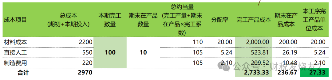 接上一篇文章《一文講透成本核算之品種法》(點(diǎn)擊即可跳轉(zhuǎn))我們講述了產(chǎn)品成本核算方法品種法,受到不少朋友喜歡今天我們繼續(xù)分享這個(gè)主題,我們講講分步法分步法是在《品種法》的基礎(chǔ)上面進(jìn)行了思維的升級(jí),在產(chǎn)品品種的維度上面+生產(chǎn)步驟這個(gè)維度,所以難度系數(shù)大大加深接下來(lái)我們進(jìn)入數(shù)據(jù)模擬整個(gè)分步法核算成本的過(guò)程生產(chǎn)A、B、C三種產(chǎn)品,需依次經(jīng)過(guò)工序1、2、3。每個(gè)工序均有期初和期末在產(chǎn)品,完工率50%。1、原材料:各工序開(kāi)始時(shí)100%投入,每個(gè)工序都會(huì)投入,按數(shù)量1:1分?jǐn)偂?/span>2、直接人工:持續(xù)投入(投入方式),按約當(dāng)產(chǎn)量(完工率50%)在完工產(chǎn)品與在產(chǎn)品間分?jǐn)偂?/span>3、制造費(fèi)用:持續(xù)投入(投入方式),每個(gè)工序都是A、B、C產(chǎn)品共用制造費(fèi)用,所以先要將制造費(fèi)用按照機(jī)器工時(shí)分?jǐn)偟紸、B、C產(chǎn)品;然后按照約當(dāng)產(chǎn)量法在完工產(chǎn)品與在產(chǎn)品間進(jìn)行分?jǐn)偅?/span>4、工序銜接:前1工序的完工產(chǎn)品投入到下一個(gè)工序進(jìn)行繼續(xù)生產(chǎn);當(dāng)然實(shí)務(wù)中可能會(huì)有很多變體,比如:當(dāng)然我們只要掌握了基本的邏輯,其他變體邏輯是相通;5、相關(guān)數(shù)據(jù)統(tǒng)計(jì)如下1)A產(chǎn)品在各個(gè)工序的投產(chǎn)數(shù)據(jù)統(tǒng)計(jì)(以A產(chǎn)品為例進(jìn)行計(jì)算)特別說(shuō)明的是,這里存在如下關(guān)系:工序2的本月投產(chǎn)數(shù)量=工序1的期末完工數(shù)量工序3的本月投產(chǎn)數(shù)量=工序2的期末完工數(shù)量實(shí)務(wù)中當(dāng)然可能存在不一定全部移送到下一工序,可能會(huì)放到【半成品倉(cāng)庫(kù)】2)制造費(fèi)用各個(gè)工序的機(jī)器工時(shí)統(tǒng)計(jì)如下(制造費(fèi)用按照機(jī)器工時(shí)在各個(gè)產(chǎn)品間進(jìn)行分?jǐn)偂?以上是背景資料,在實(shí)務(wù)中要有大量的統(tǒng)計(jì)和溝通工作,是成本核算的基礎(chǔ)工作,占整個(gè)成本核算的90%的工作量和重要性接下來(lái)就是成本核算的剩下的10%的工作量-成本核算了(一)、工序1成本核算(以A產(chǎn)品為例)1、工序1當(dāng)期發(fā)生制造費(fèi)用在各個(gè)產(chǎn)品間分?jǐn)?/span>以A產(chǎn)品為例進(jìn)行說(shuō)明(這些數(shù)據(jù)也是實(shí)務(wù)中統(tǒng)計(jì)出來(lái)的。)A產(chǎn)品的分?jǐn)偙壤?200/1000=20%分?jǐn)偟闹圃熨M(fèi)用=1000×20%=2002、期初與本期投入成本數(shù)據(jù)(A產(chǎn)品)其中制造費(fèi)用的【本期投入】金額就是取得上面【工序1當(dāng)期發(fā)生制造費(fèi)用在各個(gè)產(chǎn)品間分?jǐn)偂?/span>中的產(chǎn)品A分?jǐn)偟慕痤~200;其他的數(shù)據(jù)就是統(tǒng)計(jì)的來(lái);本表數(shù)據(jù)主要取自上面表【期初與本期投入成本數(shù)據(jù)(A產(chǎn)品)】中的數(shù)據(jù)1)材料成本對(duì)應(yīng)的約當(dāng)總量=100+10×100%=110(因?yàn)樵牧隙际窃陂_(kāi)始時(shí)一次性100%投入。)其對(duì)應(yīng)分配率=2200/110=20;完工產(chǎn)品對(duì)應(yīng)的材料成本=完工數(shù)量100×20=2000,期末在產(chǎn)品=2200-2000=2002)直接人工/制造費(fèi)用對(duì)應(yīng)的約當(dāng)總量=100+10×50%=105所以直接人工對(duì)應(yīng)的分配率=550/105=5.24;完工產(chǎn)品對(duì)應(yīng)的直接成本=完工數(shù)量100×5.24=523.81,期末在產(chǎn)品=550-523.81=26.19制造費(fèi)用對(duì)應(yīng)的分配率=220/105=2.1;完工產(chǎn)品對(duì)應(yīng)的制造費(fèi)用=完工數(shù)量100×2.1=209.52(這里應(yīng)該是210,因?yàn)樾?shù)點(diǎn)的原因),期末在產(chǎn)品=220-209.52=10.48到這里工序1的成本核算就結(jié)束了,是不是跟品種法的邏輯是一樣一樣的;(二)、工序2成本核算(以A產(chǎn)品為例)1、工序2當(dāng)期發(fā)生制造費(fèi)用在各個(gè)產(chǎn)品間分?jǐn)?/span>邏輯是不是跟工序1的計(jì)算過(guò)程一樣的唯一不同的是成本項(xiàng)目中多一個(gè)【前道工序成本】承接上一道工序轉(zhuǎn)入的完工產(chǎn)品(三)、工序3成本核算(以A產(chǎn)品為例)到這個(gè)工序我們就可以計(jì)算出來(lái)最終的產(chǎn)品成本為106.65/個(gè)