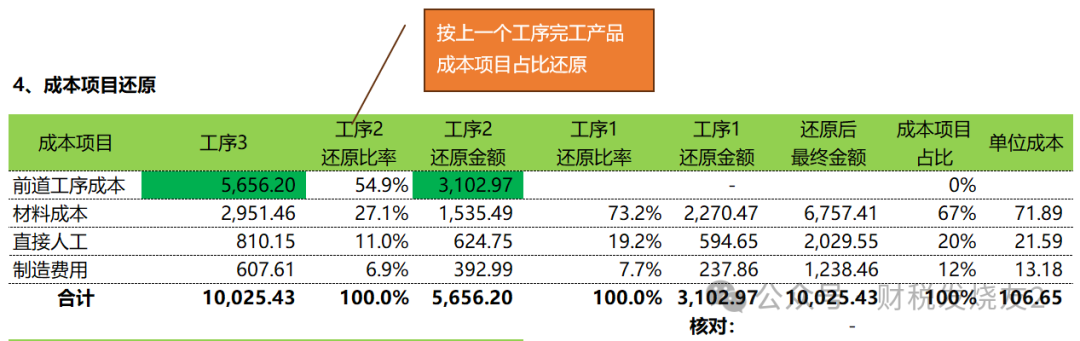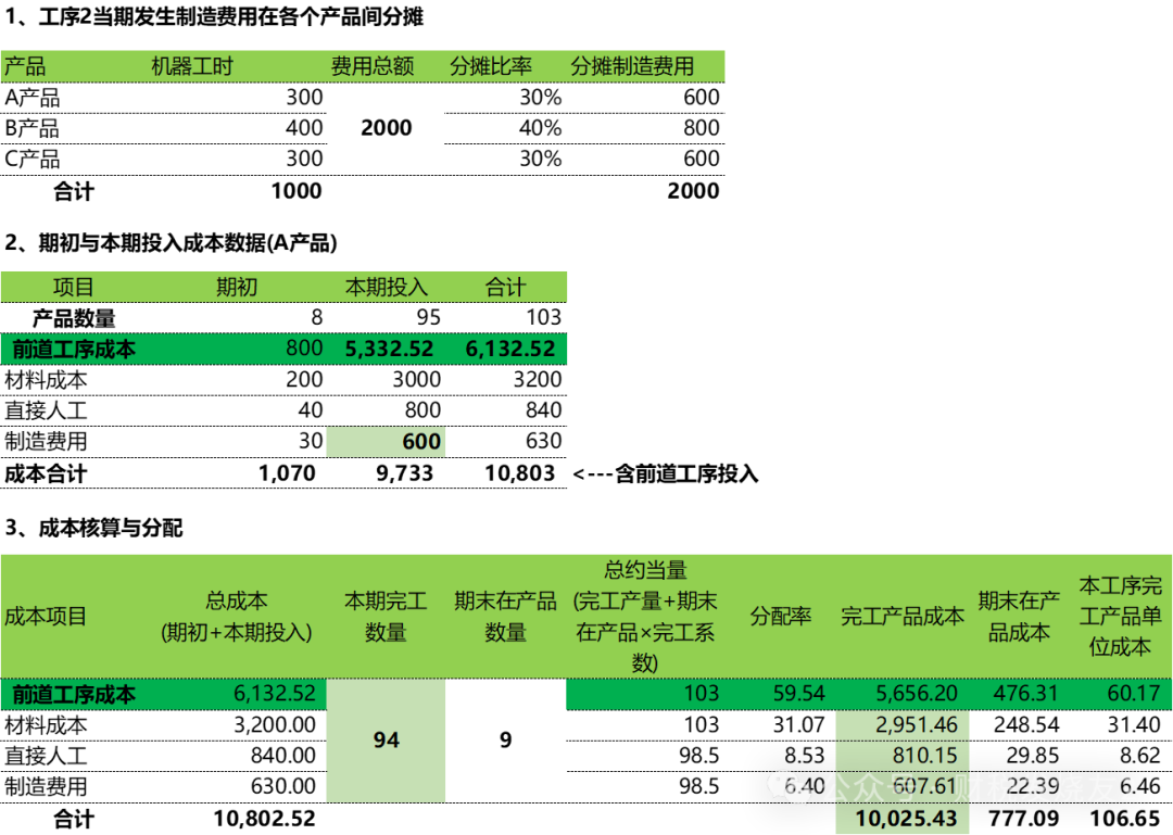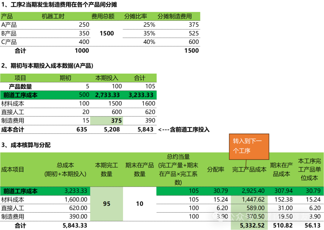 ?這個(gè)產(chǎn)品成本占比最大的是前道工序成本,占比56%,這個(gè)結(jié)構(gòu)對(duì)于管控工序3是有意義的,但是對(duì)于公司更想知道這個(gè)完工產(chǎn)品中真正的料工費(fèi)各占比多少于是我們需要進(jìn)行成本還原動(dòng)作-就是把最后1道工序中的前道工序成本進(jìn)行還原為真正的料工費(fèi)成本還原我們則要逆著來(lái)從工序3→工序2→工序1我們從工序3開(kāi)始,因?yàn)橥旯こ善分杏星暗拦ば虻某杀?656.2就是依據(jù)什么將這5656.2分?jǐn)偟焦ば?中的成本項(xiàng)目結(jié)構(gòu)呢?我們依據(jù)上一個(gè)工序完工產(chǎn)品的各成本項(xiàng)目占比進(jìn)行還原比如工序2中的完工產(chǎn)品中的前道工序成本占比=2,925.40/5,332.52=54.9%;同樣的方法可以計(jì)算出材料成本占比=27.1%;直接人工占比=11%;制造費(fèi)用占比=6.9%;所以工序3中的前道工序的成本5656.2還原到工序的過(guò)程:前道工序成本=5656.2×54.9%=3102.97材料成本=5656.2×27.1%=1535.49制造費(fèi)用=5656.2×6.9%=392.99然后繼續(xù)將工序2中的前道工序成本3102.97繼續(xù)還原到工序1的成本項(xiàng)目構(gòu)成依據(jù)的就是工序1中的完工產(chǎn)品的成本項(xiàng)目占比還原成功后就將工序3、工序2和工序2的料工費(fèi)加起來(lái)就有了最終完工產(chǎn)品的料工費(fèi)金額:當(dāng)然我們也可以計(jì)算出完工產(chǎn)品成本中每個(gè)工序的成本占比:當(dāng)然B產(chǎn)品和C產(chǎn)品的計(jì)算邏輯跟上面是一樣的。