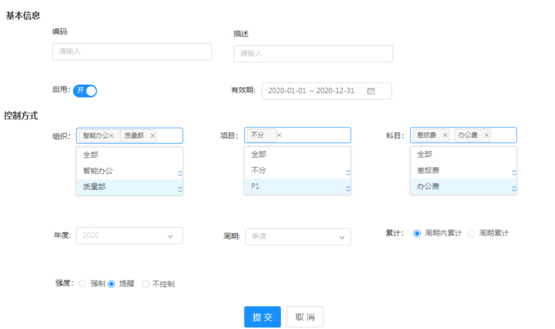 預(yù)算控制平臺是依據(jù)預(yù)算編制結(jié)果及預(yù)算控制策略,對業(yè)務(wù)流程實施控制的平臺。該平臺通過設(shè)定組織、項目、預(yù)算科目、控制強度、控制周期、年份等維度組合,來定義控制業(yè)務(wù)流程的具體規(guī)則。