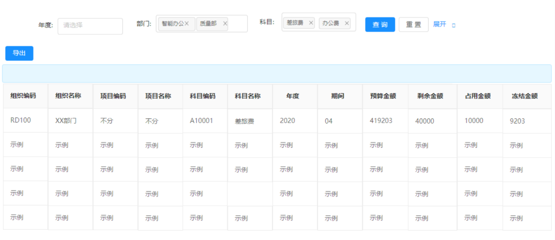 其中“組織、項目、科目、年度、期間、版本需唯一,不能重復(fù)”,需單獨記錄調(diào)撥中金額;預(yù)算原金額為從預(yù)算同步過來數(shù)據(jù),記錄預(yù)算版本,預(yù)算原金額不更新更改。 預(yù)算余額(YTD)=本季預(yù)算金額-本季凍結(jié)金額-本季占用金額; 預(yù)算金額的計算公式為:預(yù)算金額 = 預(yù)算原金額 - 調(diào)撥金額。 預(yù)算余額(QTD,即季度至今)的計算公式為:本月預(yù)算余額 = 本月預(yù)算金額 - 本月凍結(jié)金額 - 本月占用金額。 預(yù)算余額(YTD,即年至今)的計算公式為:本季預(yù)算余額 = 本季預(yù)算金額 - 本季凍結(jié)金額 - 本季占用金額。 07.凍結(jié)與占用明細 主要提供預(yù)算凍結(jié)和占用明細信息的查詢服務(wù)。