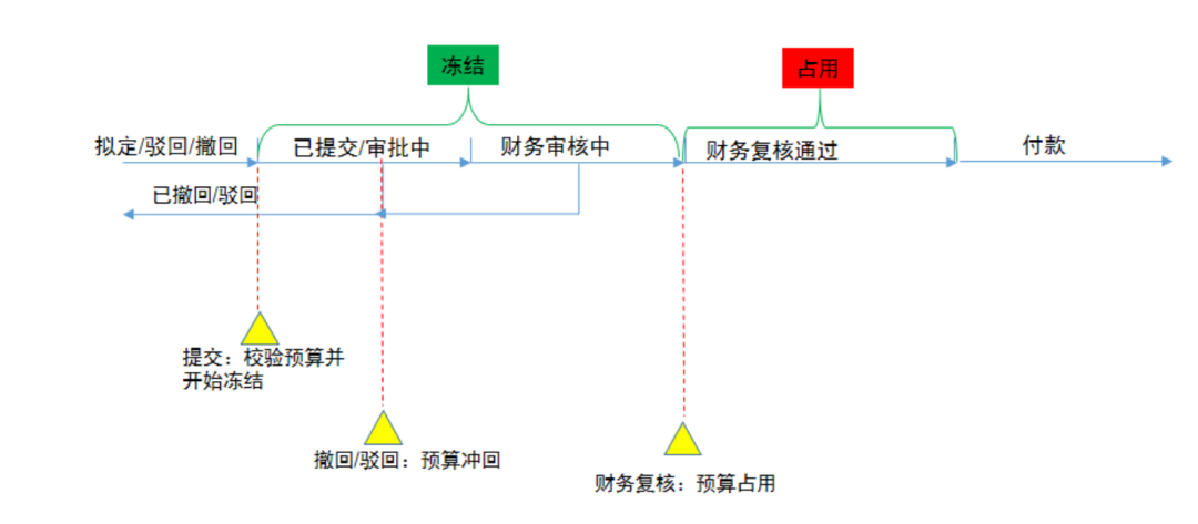 通過費用報銷業(yè)務(wù)流程可以看出,預(yù)算控制并非一次性動作,而是需要在每個業(yè)務(wù)節(jié)點都進行相應(yīng)的控制操作。例如,在申請時進行占用控制,通過時進行耗用控制,不通過時進行沖回控制等。
