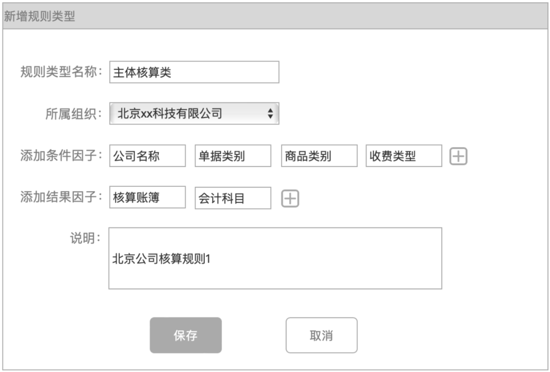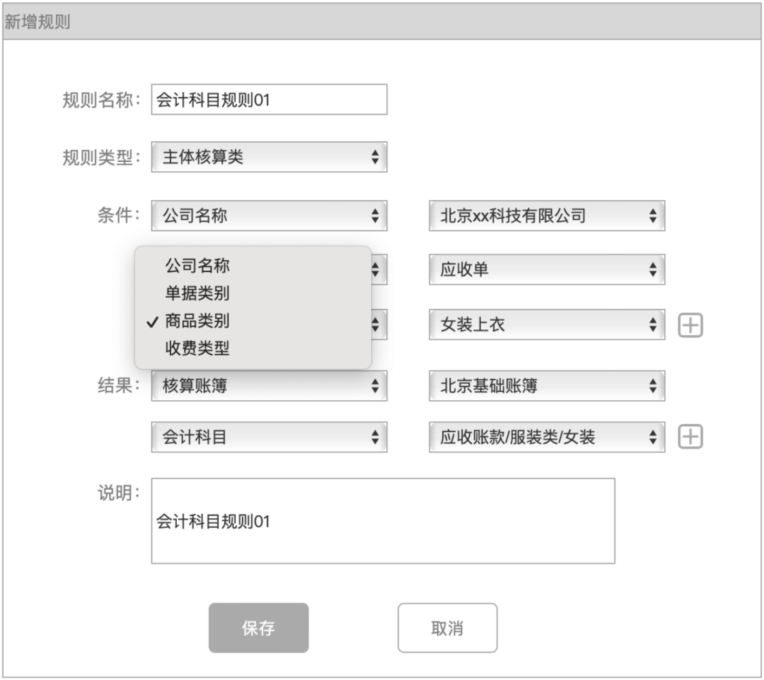 理解為:如果業(yè)務數據上的公司名稱是【北京xx科技有限公】,單據類別是【應收單】,且商品類別是【女裝上衣】時,那么此條業(yè)務數據對應到賬務系統(tǒng)中的核算賬簿是【北京xx科技】,且會計科目是【應收帳款/服裝類/女裝】。以上只是介紹了會計引擎規(guī)則基本的構成,具體規(guī)則內容,還需要結合公司具體的業(yè)務場景、業(yè)務流程以及賬務處理方式等進行詳細梳理。盡管不同公司、不同業(yè)務的會計引擎內容大不相同,但配置頁面,萬變不離其宗。考慮到需要配置的規(guī)則數量大,適用場景多,我們在實際應用中可以在規(guī)則的結構上增加一級——“規(guī)則類型”以便管理和配置。通過維護規(guī)則類型,限定每類規(guī)則可以使用的條件和結果因子,縮小配置規(guī)則時的選擇范圍。下面舉例一個簡單的模型,這里我們默認條件和結果之間的判斷詞為“則”,同一規(guī)則各條件、結果之間的組合邏輯均為“且”。即:如果“條件1”且“條件2“,則“結果1”。所屬組織用來限定當前規(guī)則適用的組織范圍;條件因子和結果因子是數據庫內已有的字段,用戶通過選擇的方式任意添加(條件和結果至少各一個),添加即:指定該種規(guī)則類型對應可選的條件或結果。每條規(guī)則都需要選擇已有的規(guī)則類型。條件、結果下拉列表中帶出的條件因子和結果因子,會根據已選擇的規(guī)則類型決定。可添加多個條件和多個結果。條件因子的值、和結果因子的值,即所選條件和結果因子對應的枚舉值,例如:以上會計引擎的功能模型、原型頁面等都是最簡單的邏輯,在實際應用當中需要根據業(yè)務復雜程度、用戶個性化要求、服務器性能等再做相關設計。
